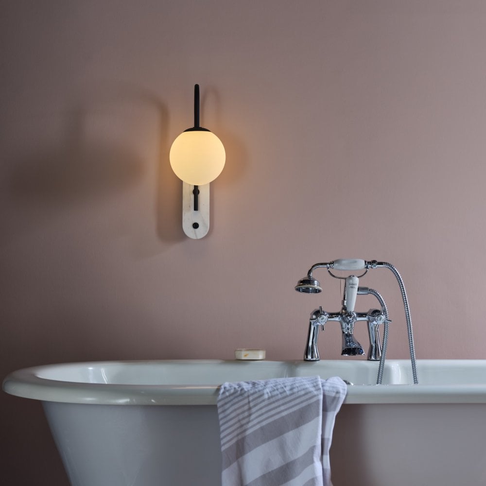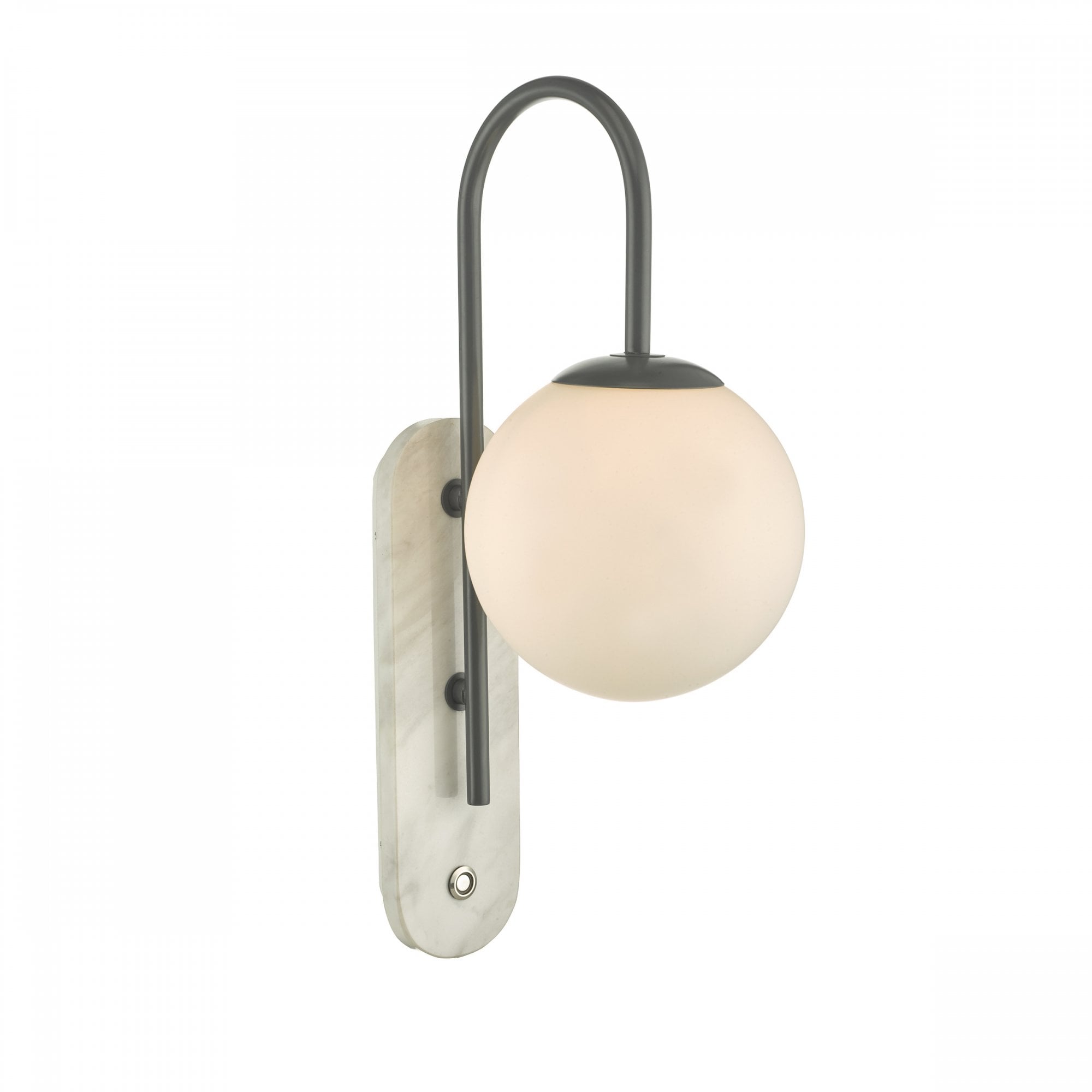 The beautiful Deuce wall light features a dark grey curved arm with an opal glass shade. Mounted on a white, marble plate with a discreet push button.