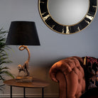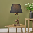 The Dwayne monkey table lamp In a bronze finish with a black linen shade. Featuring a black fabric cable and inline rocker switch. This cheeky monkey table lamp joins our animal wall lamps and tropical floor and ceiling lamps.