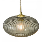 The Edmond single pendant has a modern ribbed shade in smoked glass with stain brass details and a braided fabric cable.