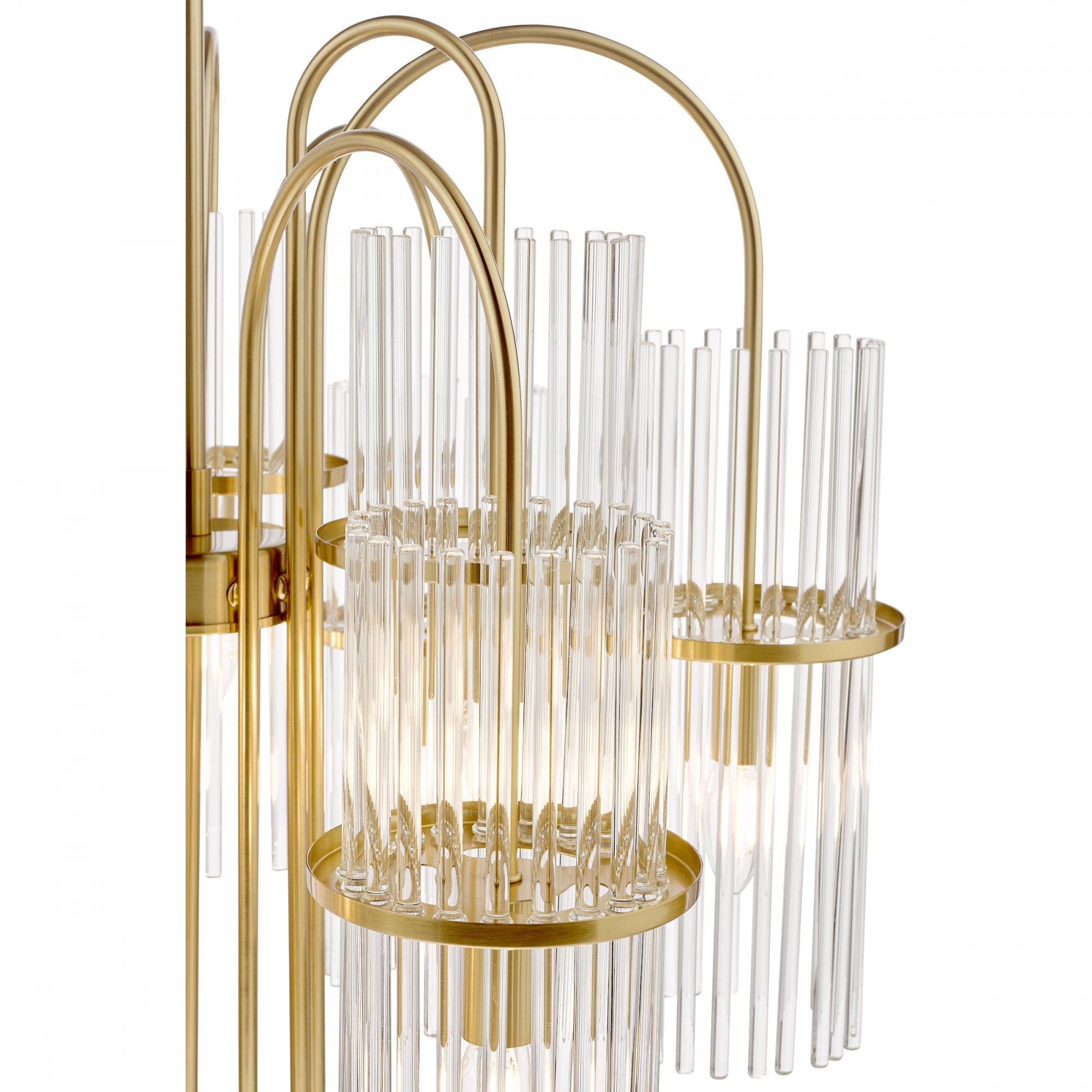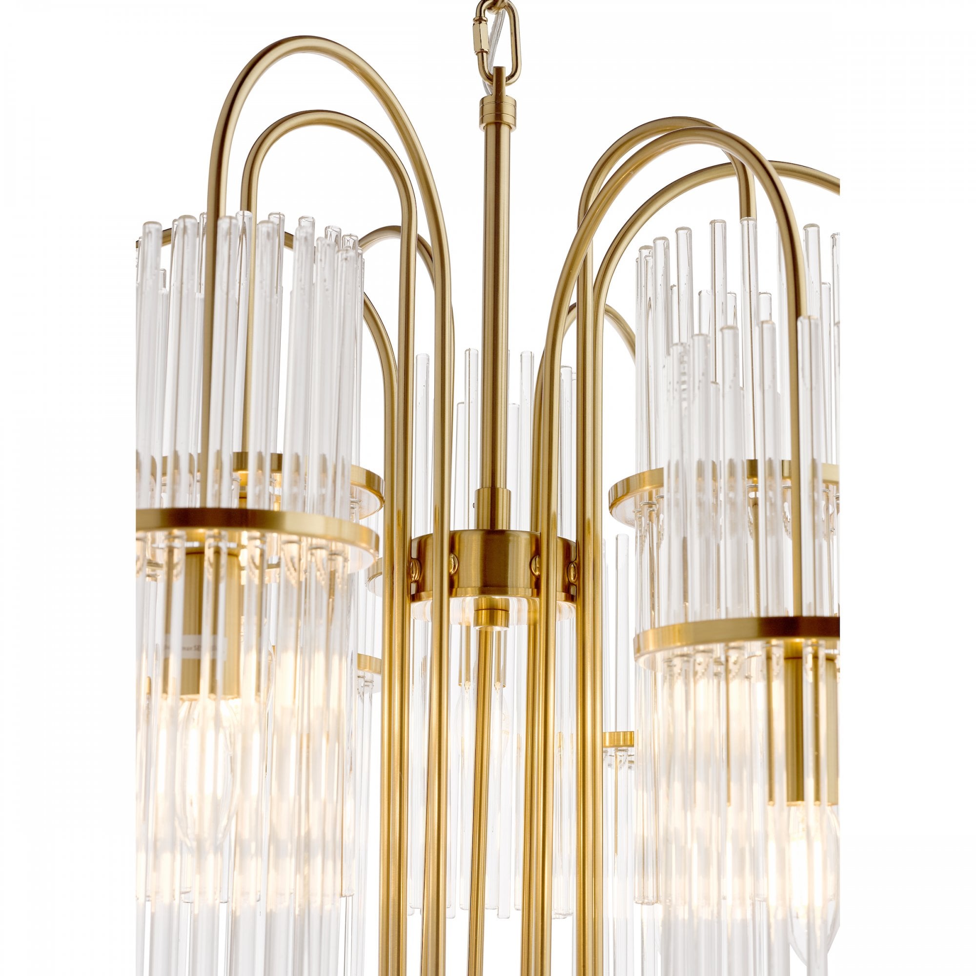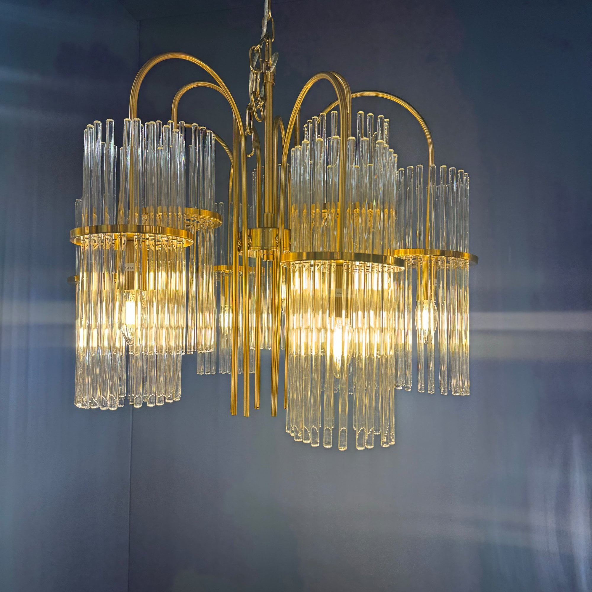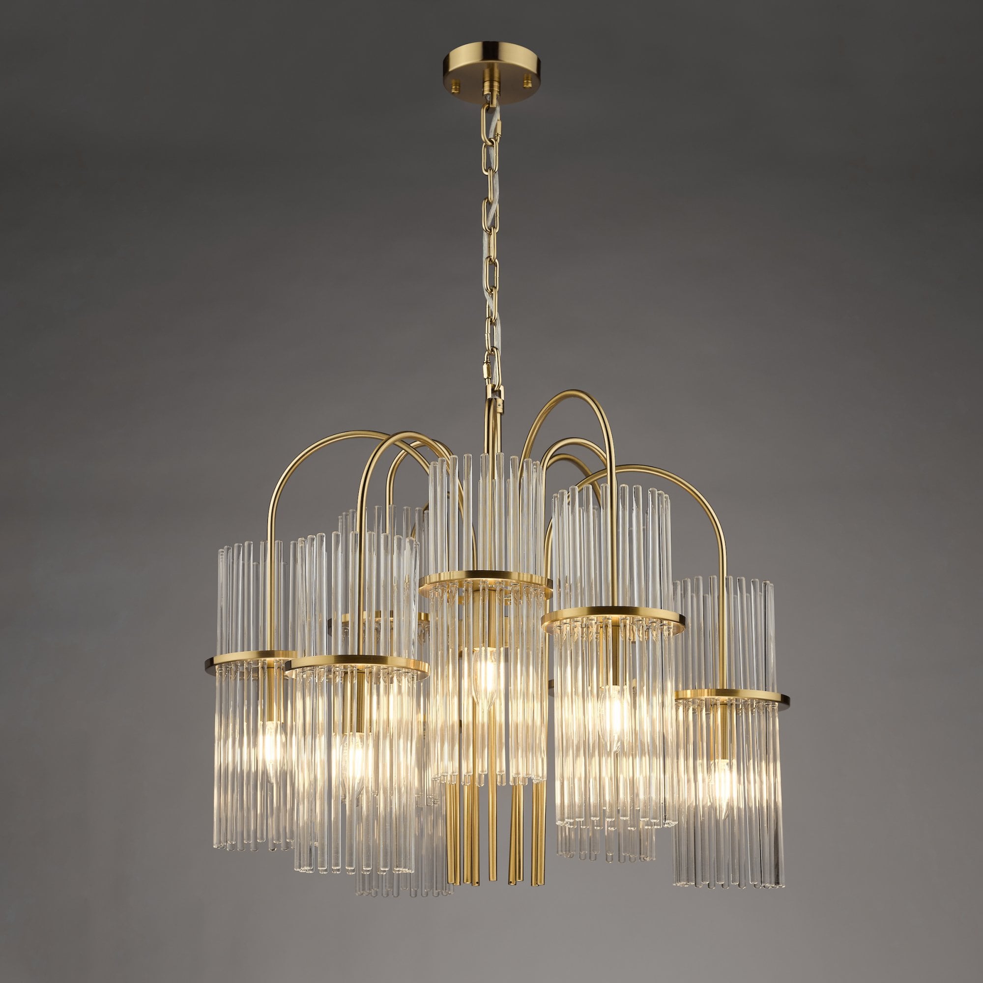 The Eniola 9 Light Chandelier is a stunning lighting fixture that adds elegance and charm to any home decor. With its nine individual pendant lights, this fixture creates a beautiful cascading effect, illuminating the space with a warm and inviting glow. The natural brass finish gives it a timeless appeal, while the glass shades, comprised of individual glass rods, add a touch of sophistication. This pendant is perfect for various areas within the home, such as the dining room, living room, or grand entrance hall, where it can be hung in a prominent position to become a focal point of the space. Whether used solo or grouped together, the Eniola Pendant effortlessly brings a touch of luxury and style to any interior. Height is adjustable at the point of installation (64-177cm).