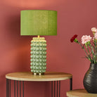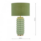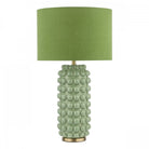 The Etzel Green Ceramic Table Lamp is a contemporary design with a tall lozenge shape covered in large bobbles, hand-glazed in olive green with antique brass metal-work, topped with a deep olive green linen shade.