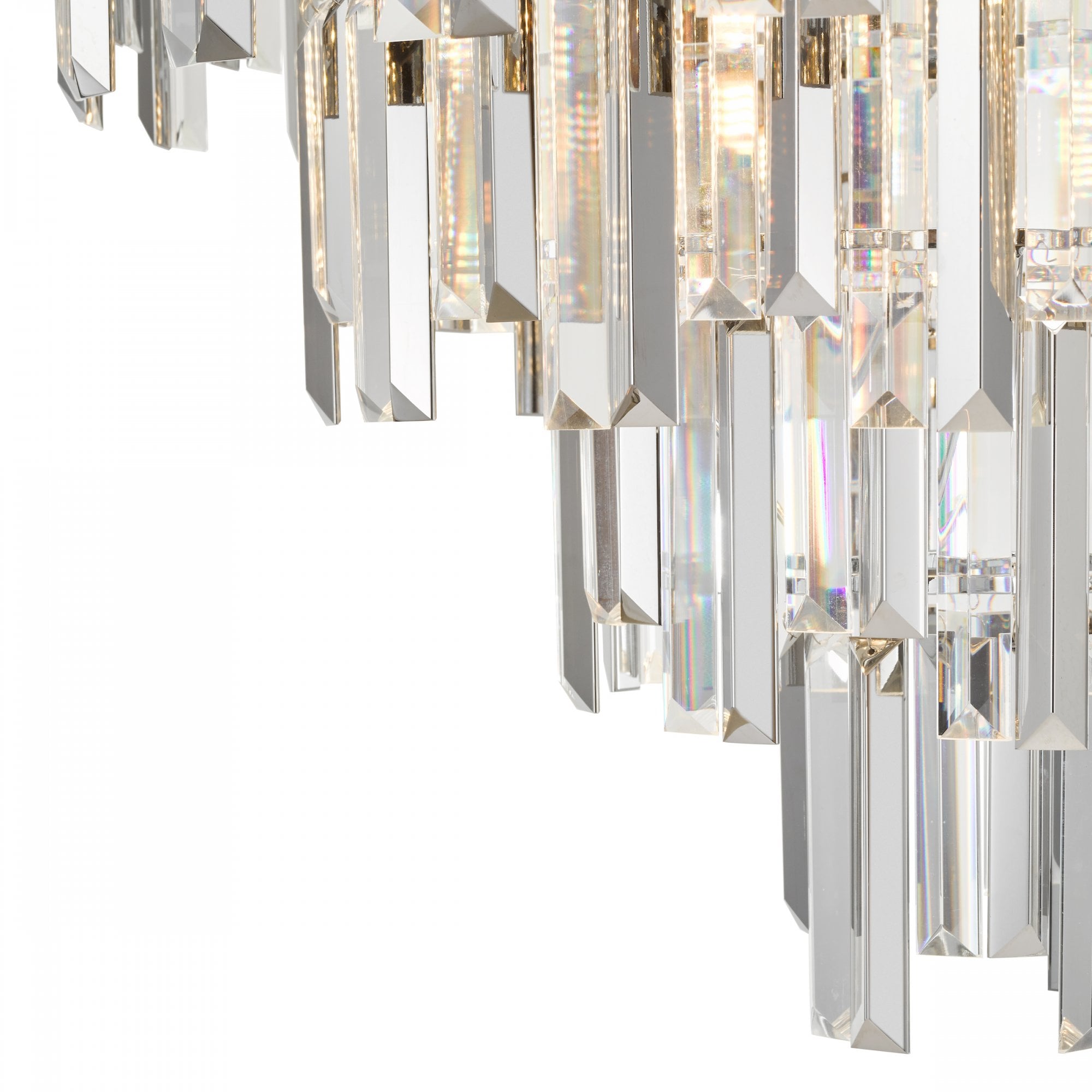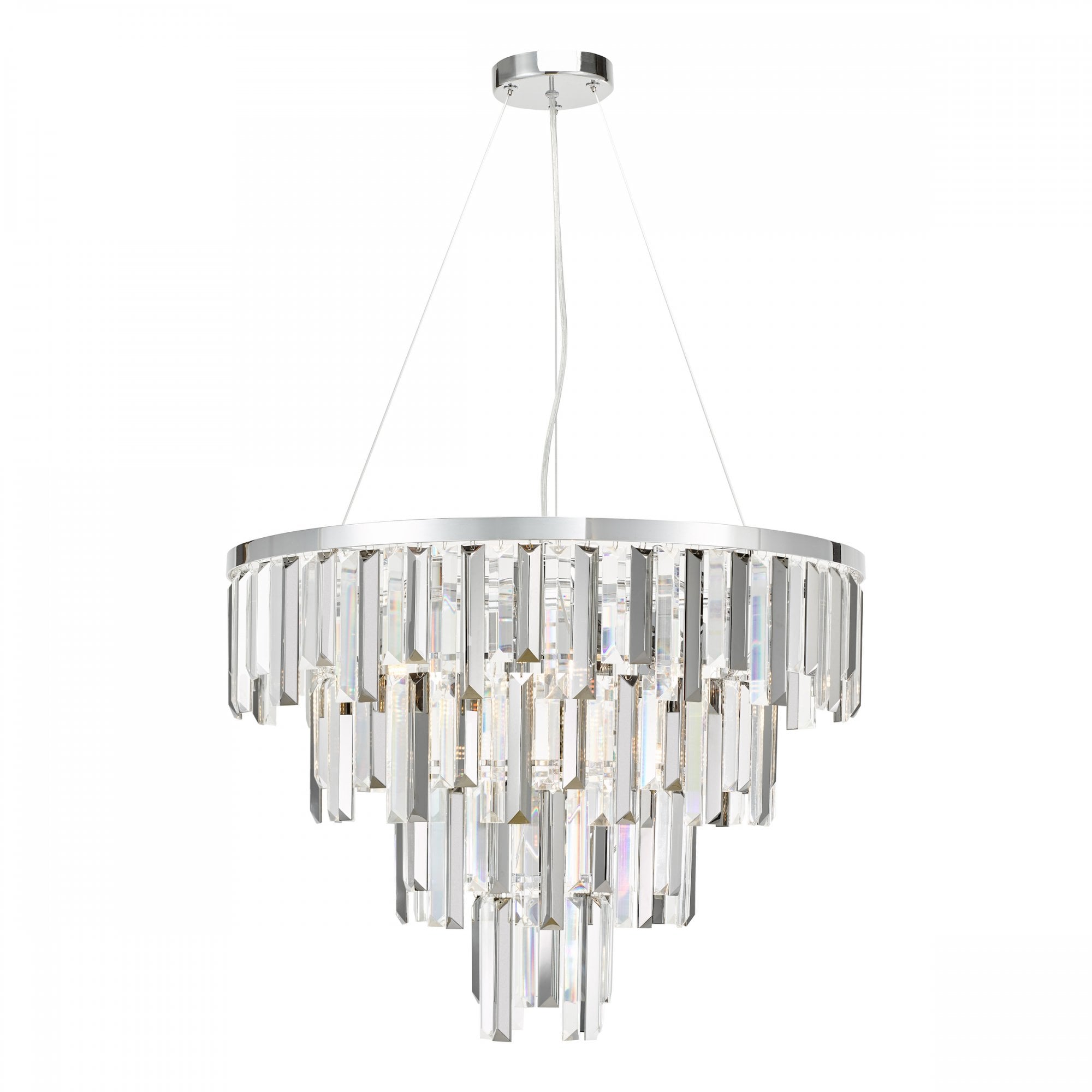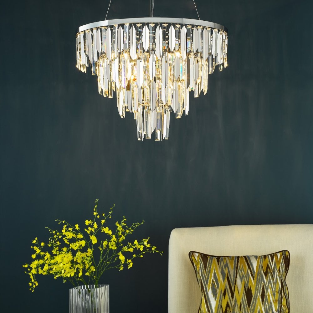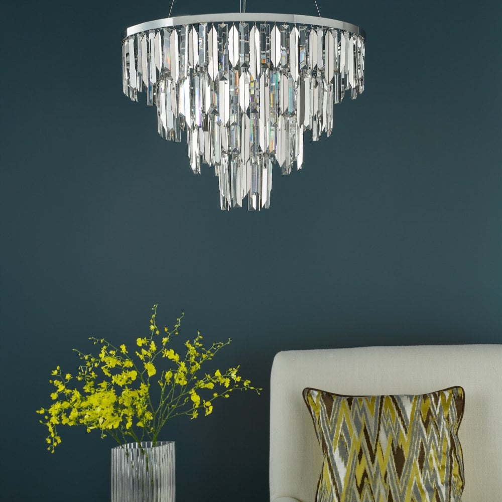 Elevate your space with the Fuentes Chandelier, a stunning crystal ceiling light from dar lighting that marries classic glamour with contemporary flair. This grand tiered crystal chandelier boasts five lights nestled among alternating clear and smoked crystals, creating a dazzling display when illuminated. The polished chrome finish adds a sleek, modern touch to this reimagined traditional design. Perfect for making a statement in dining rooms or entryways with ample ceiling height, the Fuentes collection also offers a matching flush option for those with lower ceilings. Whether you're after a touch of opulence or a conversation starter, this crystal chandelier from dar lighting is sure to shine as the centerpiece of any room.