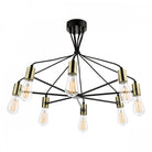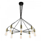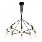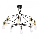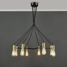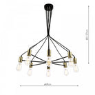 The Gabriel 8 light pendant has a contemporary industrial look with satin black metal work and black fabric cables. This simple fitting is brought to life with gold metal accents and can be used with globe lamps or vintage lamps (sold separately).