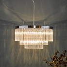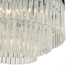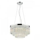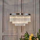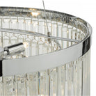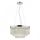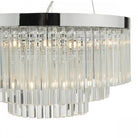 The GIOVANA 5lt pendant in polished chrome is comprised of three tiers of smoked crystal to give a modern take on the usual tiered chandelier. Suspended with three high tensile steel cables, which can be adjusted on installation.