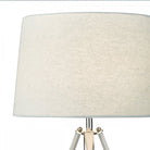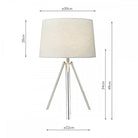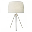 A polished chrome tripod table lamp with grey braided cable, supplied complete with grey linen shade. The bright chrome surface gives a more graceful interpretation of the industrial tripod lamp.