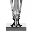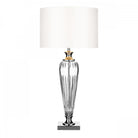 The HINTON 1lt Table Lamp features crystal glass base and polished chrome plinth and has a white faux silk drum shade.