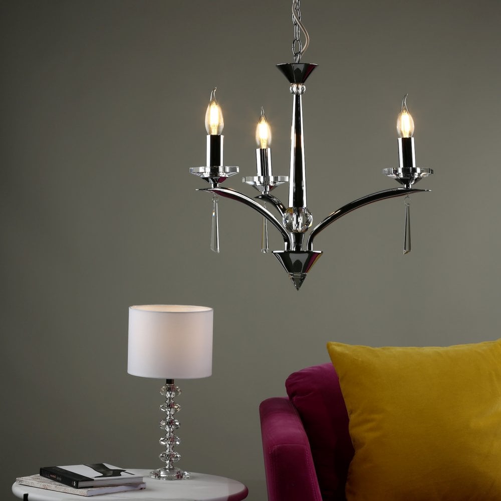 The Hyperion 3lt pendant is the perfect choice for modern interiors. With faceted crystal glass detailing to the central column, sconces, pointed finial and decorative, tapered baguette droppers make the fitting ultra-stylish .
