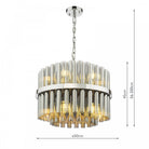 The Imani 12 light pendant in polished chrome and smoked glass brings contemporary glamour with refined elegance. Oversized ribbed smoked glass rods encircle a sleek chrome ring, casting a softly diffused glow with subtle architectural detail. The polished chrome interior enhances the reflections, creating a floating glass effect that adds depth and sophistication. Suspended on a 1.5m chain for adjustable height, this striking pendant is ideal for dining rooms, lounges, or hallways where statement lighting with modern edge is desired.