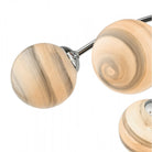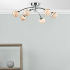 The Izzy 6 light semi flush ceiling light in polished chrome and Planet art glass. The hand blown are glass shades mimic planets with shades of blues, oranges and grey on a white background, looking spectacular both on or off. The polished chrome metal work as a premium feel to this semi flush ceiling light.