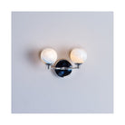 The Izzy 2 light wall light in polished chrome and Planet art glass. The hand blown are glass shades mimic planets with shades of blues, oranges and grey on a white background, looking spectacular both on or off. The polished chrome metal work as a premium feel to this wall light.
