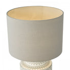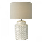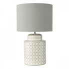 The Kedron Table Lamp reinterprets the elegance of a classic Chinese tea caddy for modern interiors. Its ceramic base is decorated with a delicate pale grey leaf frond motif, offering a look that feels both traditional and quietly contemporary. A soft grey linen shade with matching lining diffuses a warm, inviting glow, perfect for living rooms, bedrooms, hallways or reception areas. Finished with a luxury white braided cable and in-line switch, the Kedron balances style with practicality. Decorative yet understated, it anchors a room with timeless charm while blending effortlessly into relaxed interior schemes.