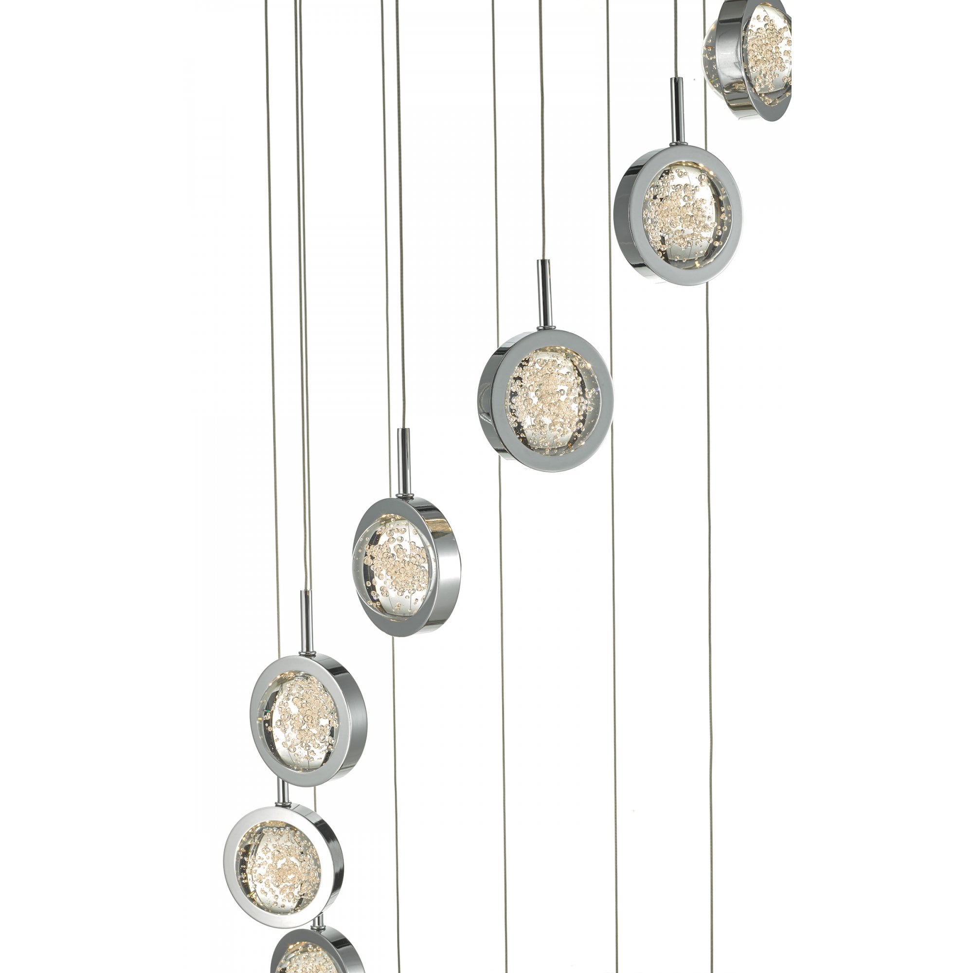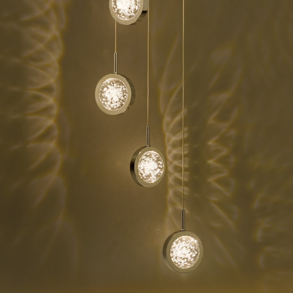The LIVIA is a spiral cluster of highly polished nickel with spheres of bubble infused glass lit by hidden LEDs to create a unique effect. The latest LED technology ensures that the light output is suitable to fill a room whilst using minimal energy. Height adjustable on installation.