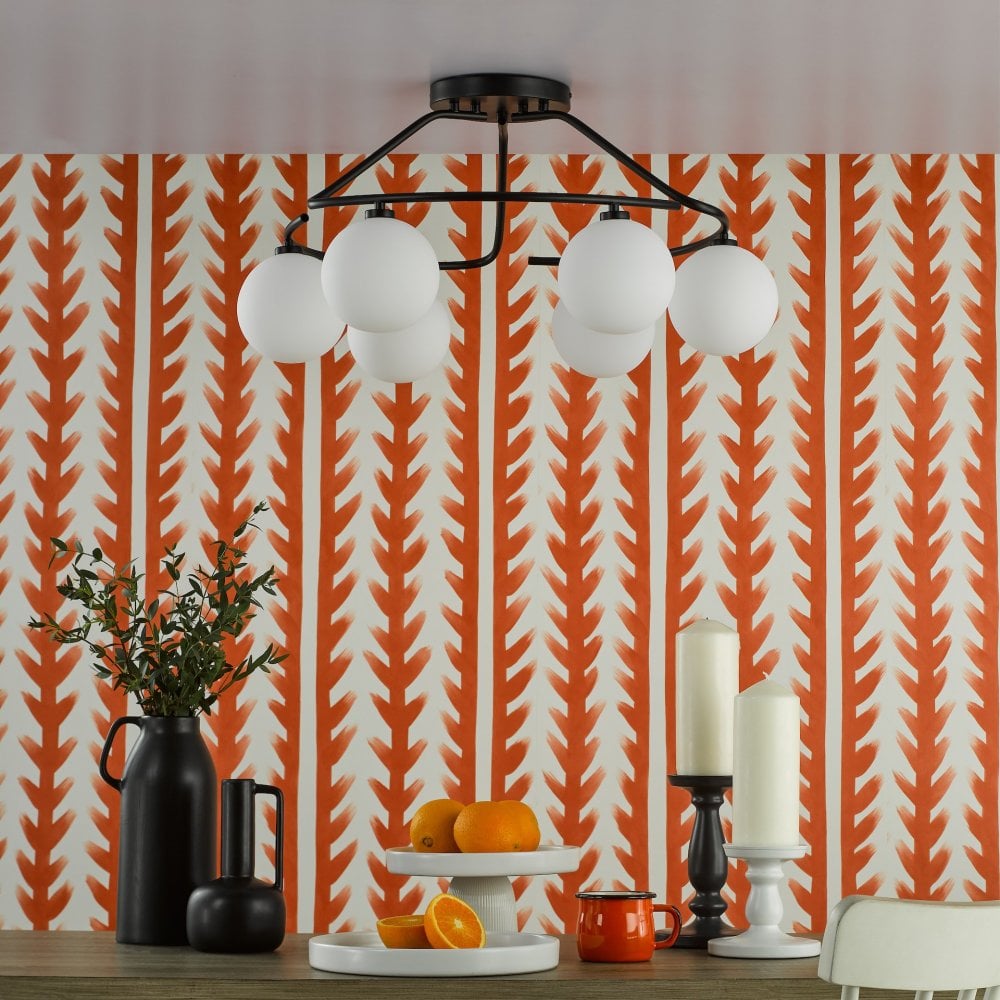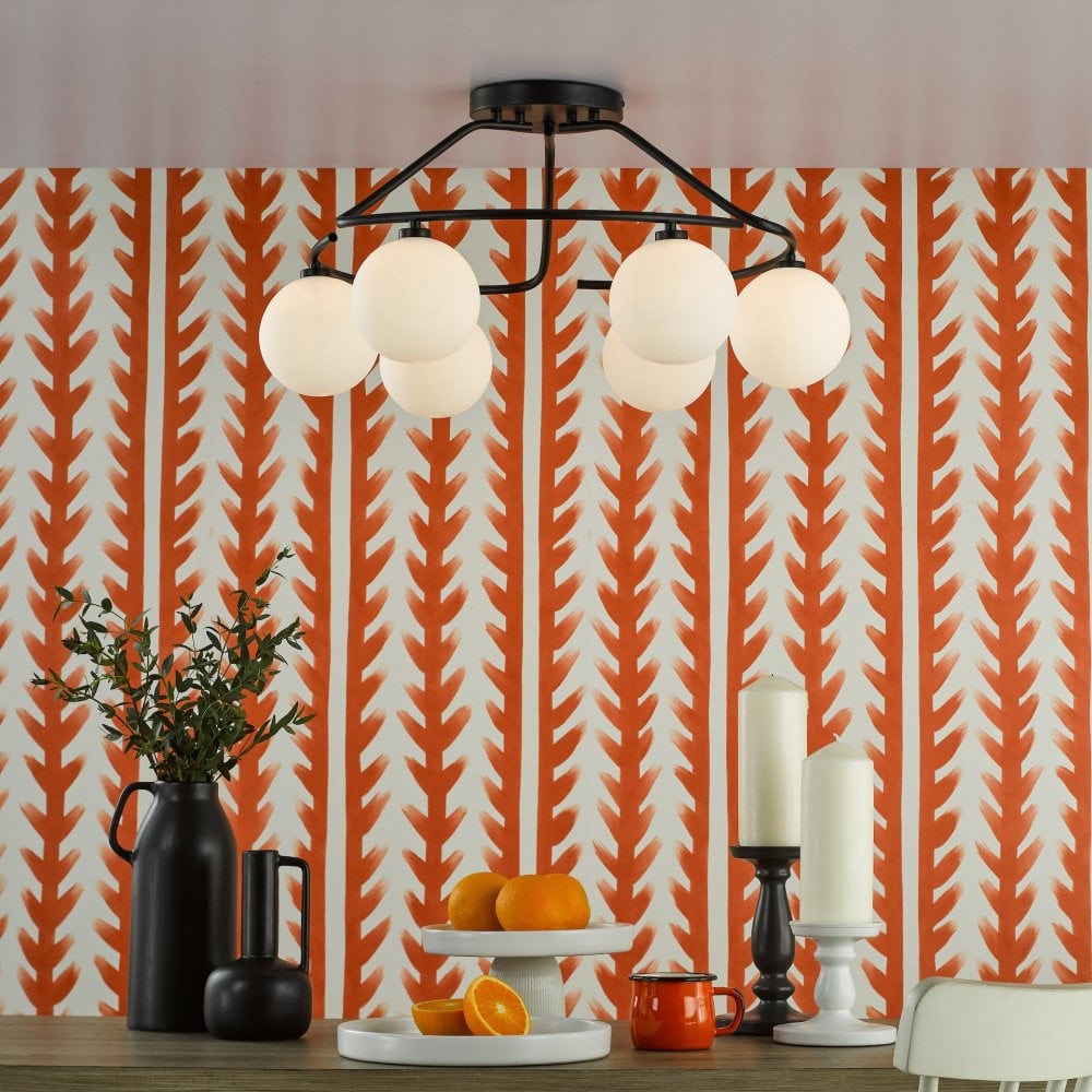 Illuminate your space with the Luana ceiling light from dar lighting, a contemporary masterpiece that marries form and function. This black ceiling light boasts six oversized opal glass shades, delivering a bright ceiling light that bathes your room in a warm, welcoming glow. Perfect for low ceilings, the semi-flush design keeps things sleek and unobtrusive. The matt black finish adds a touch of sophistication, while the opal glass diffuses light beautifully, creating a cosy atmosphere. Whether you're after a statement piece for your living room or a bright focal point for your kitchen, the Luana ceiling light delivers in spades. And if you're feeling adventurous, there's even a linear version available for those who like to mix things up.