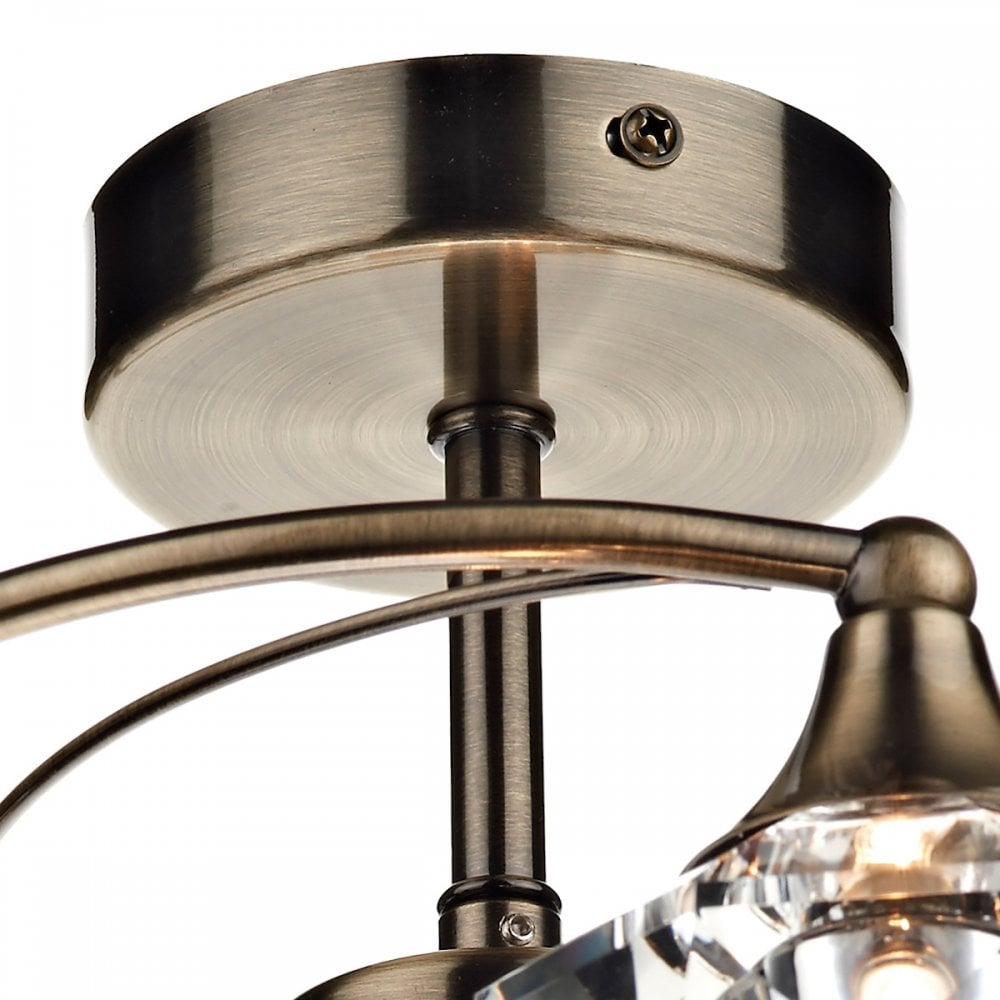 For a touch of sparkle, introduce the Luther ceiling light fitting to your home. With four clear faceted crystal glass shades suspended from three curved double arms with an antique brass finish, with one in the centre, it brings to mind the most ginormous diamond engagement ring ever!