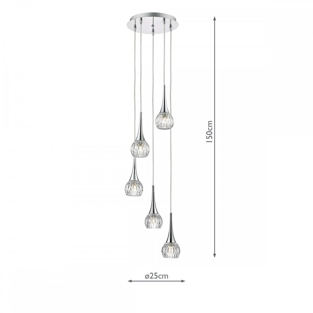 The Lyall pendant light boasts beautiful cut-glass style pumpkin shaped glass shades with elegant, elongated polished chrome caps. Arranged in a gentle spiral, the 5 lights of this cluster pendant fitting sparkles with light. Lyall is designed with a maximum drop of 1. 5 metres, so will suit an interior space with height.
