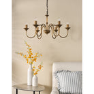 The Lydian 6 Light Pendant combines classic elegance with refined farmhouse character, making it a striking choice for larger rooms. Crafted in warm antique bronze with subtle starburst detailing, it delivers generous illumination for living rooms, dining spaces, halls, or stairwells. Use with fabric shades for a softer cottage feel or without for a more sophisticated look. The Lydian adapts easily from bright, functional lighting to a warm, atmospheric glow, offering both practicality and timeless style.