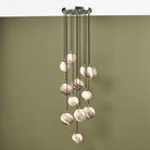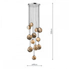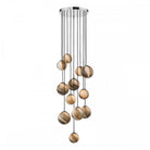 The Mikara 12 Light Cluster Pendant is a cluster ceiling light of 12 art glass pendants with a subtle blue and orange marble effect inspired by the planets with polished chrome detailing.