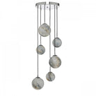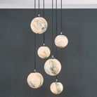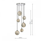 The Mikara 6 Light Cluster Pendant MIK0650 is a cluster of 6 art glass pendants with a subtle blue and orange marble effect inspired by the planets with polished chrome detailing. Height adjustable to suit any space.