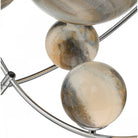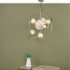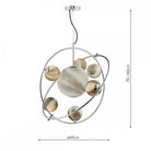 This wonderful 7 light pendant consists of 6 art glass shades with a subtle blue and orange marble effect inspired by the planets orbiting a larger glass shade in the same style with a polished chrome frame Featuring a 1m of steel tension cable and black cloth cable which can be shortened on installation.