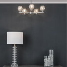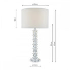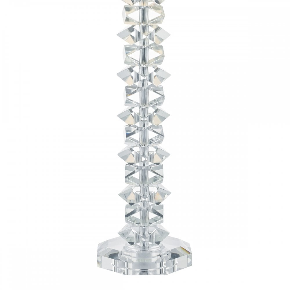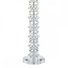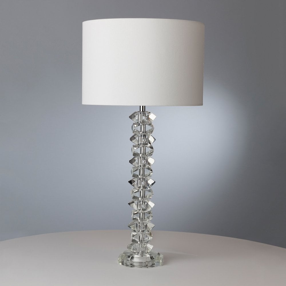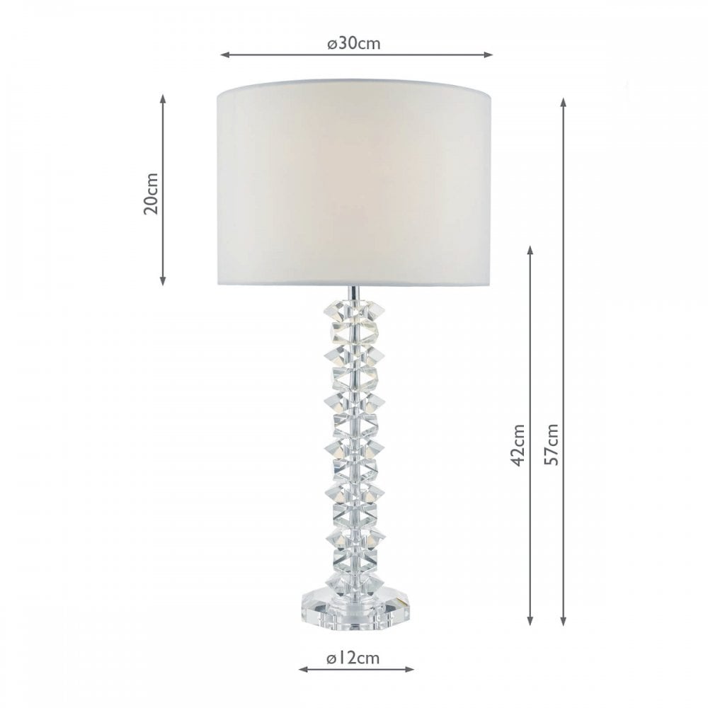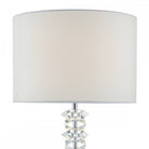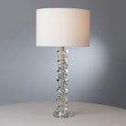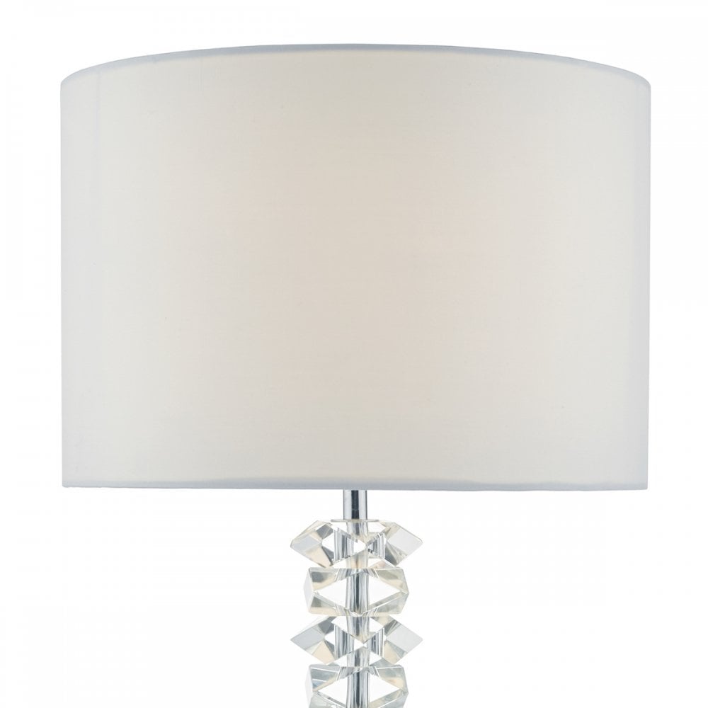 The MINA table lamp in polished chrome has a stem of stacked shard-cut crystals. Supplied complete with cream cotton drum shade and an inline switch on the cable flex. Matching wall light and five-light pendant also available.