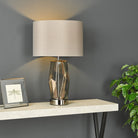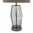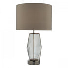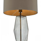 The Mubina touch table lamp is a contemporary smoked glass table lamp. With a faceted glass design having the appearance of a naturally formed crystal. The design is completed with a contemporary grey cotton shade.
