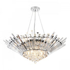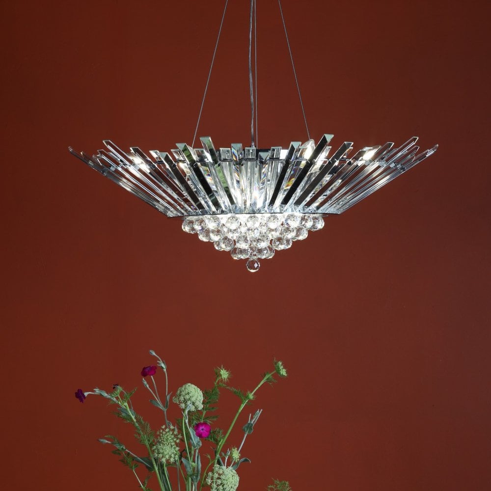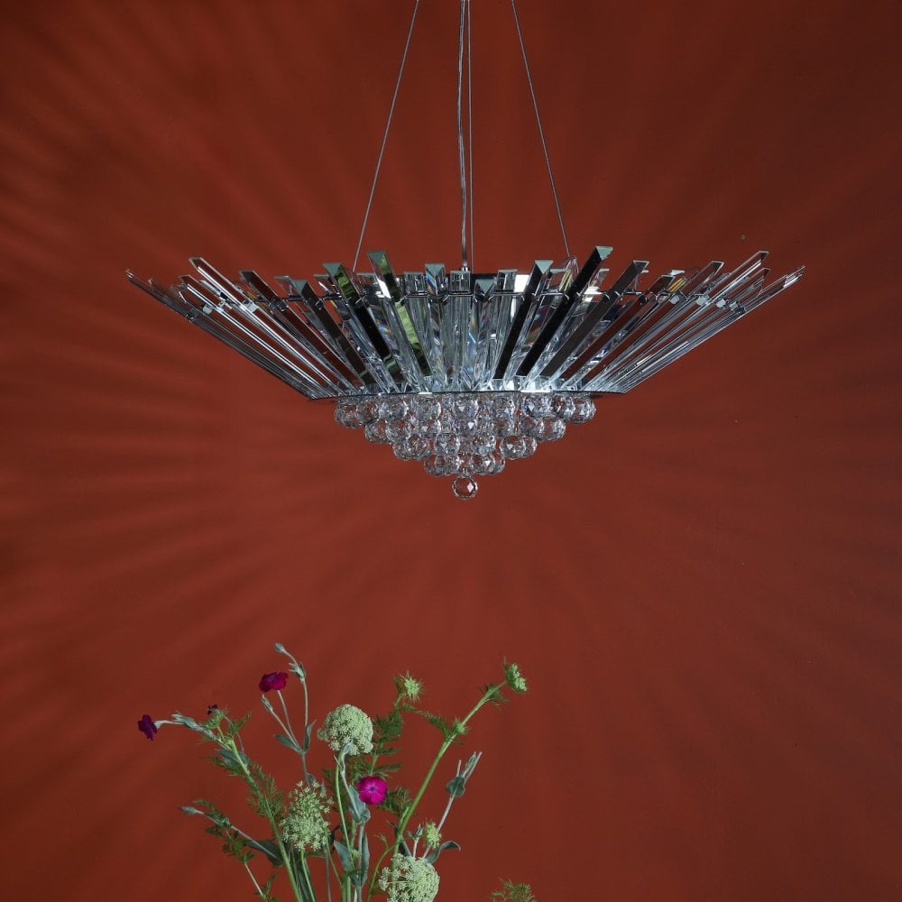 The Nimbus 9 Light Crystal Chandelier is a stunning contemporary crystal chandelier, inspired by a ballerina ring. A starburst of coffin crystal surrounds a centre of faceted crystal drops, the shallow yet impressive fitting is very versatile, hung with steel tension cables, it appears to float in the room and can be adjusted in height to a minimum of 50cm. A statement in any room, perfect in a lounge, grand entrance way or over a dining table or bed.