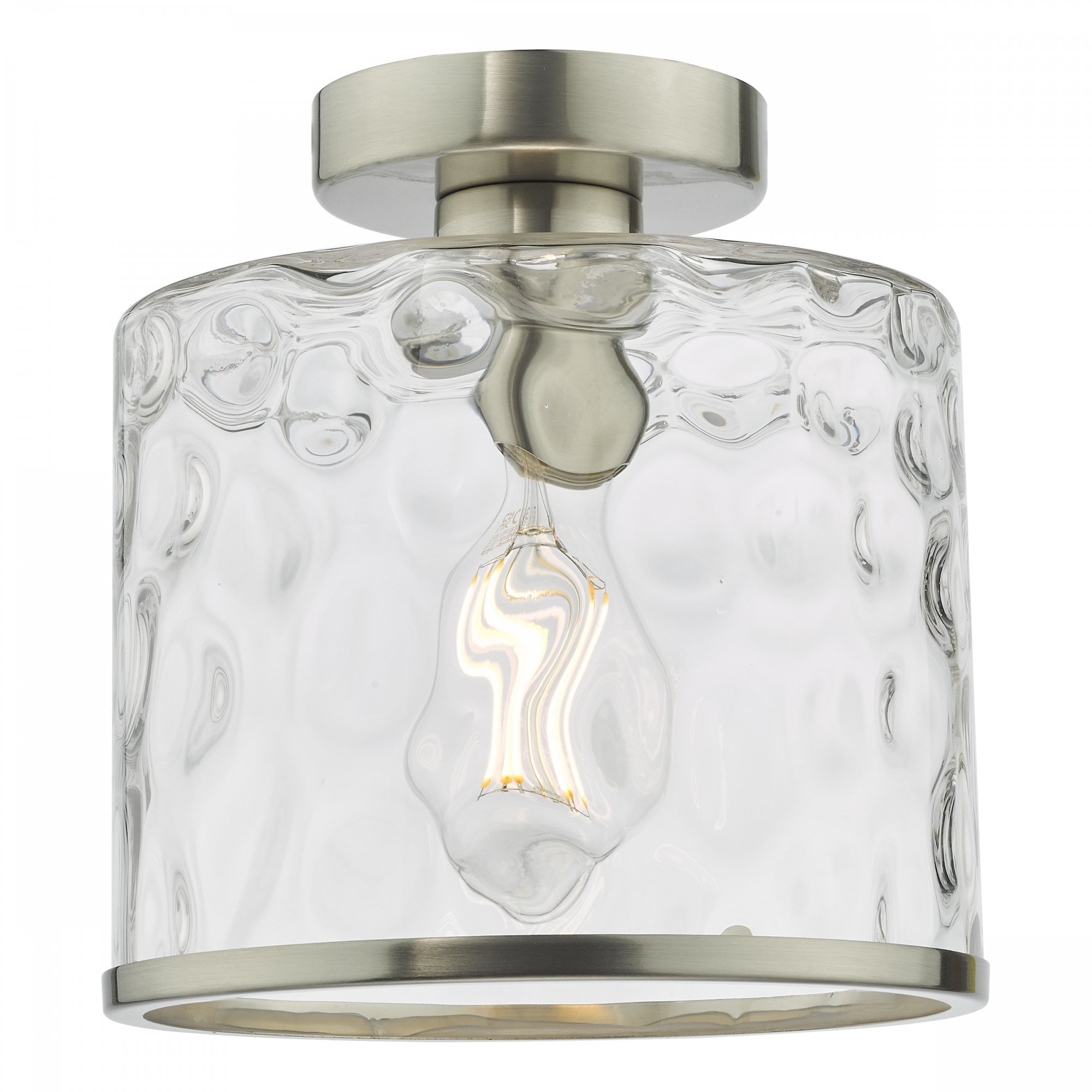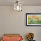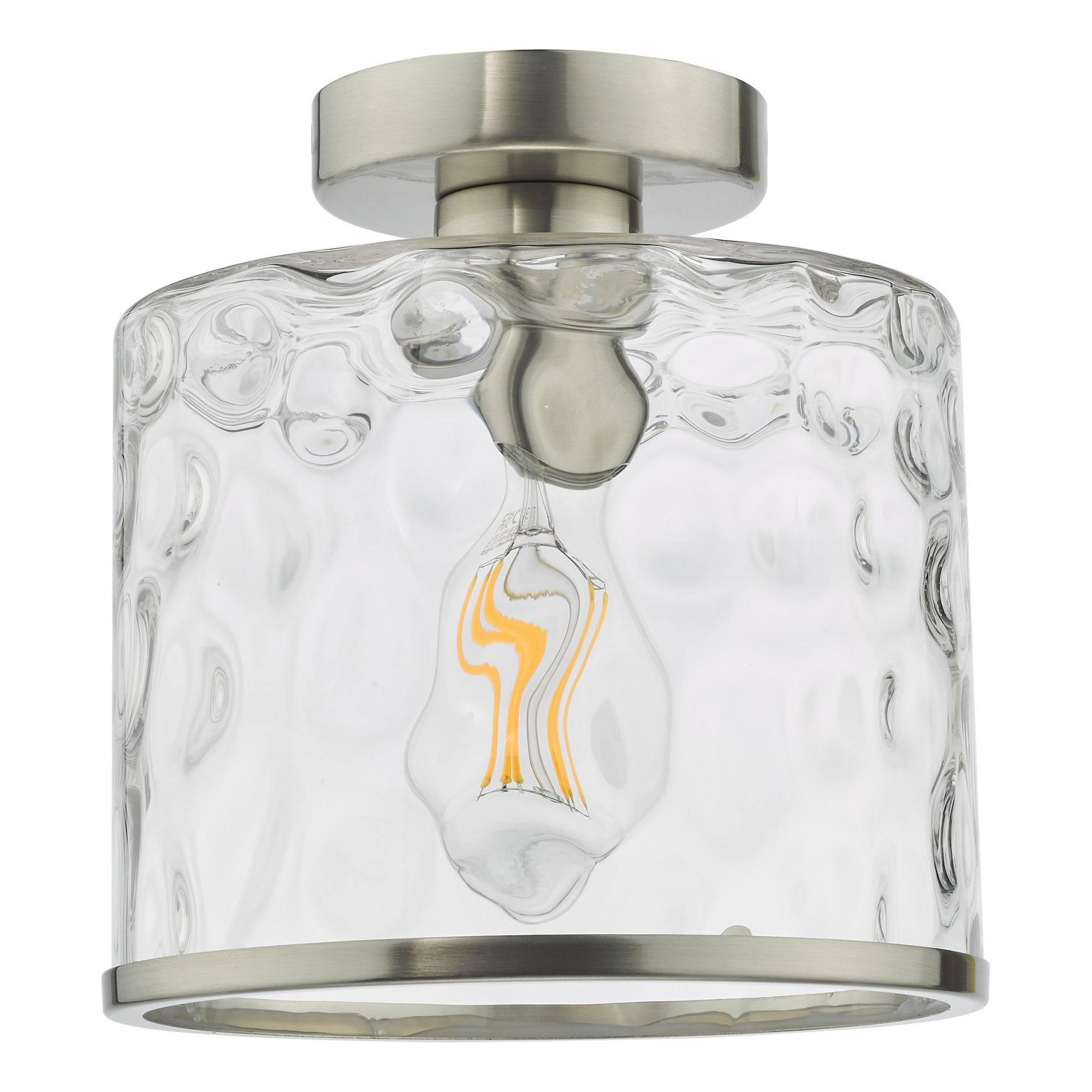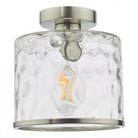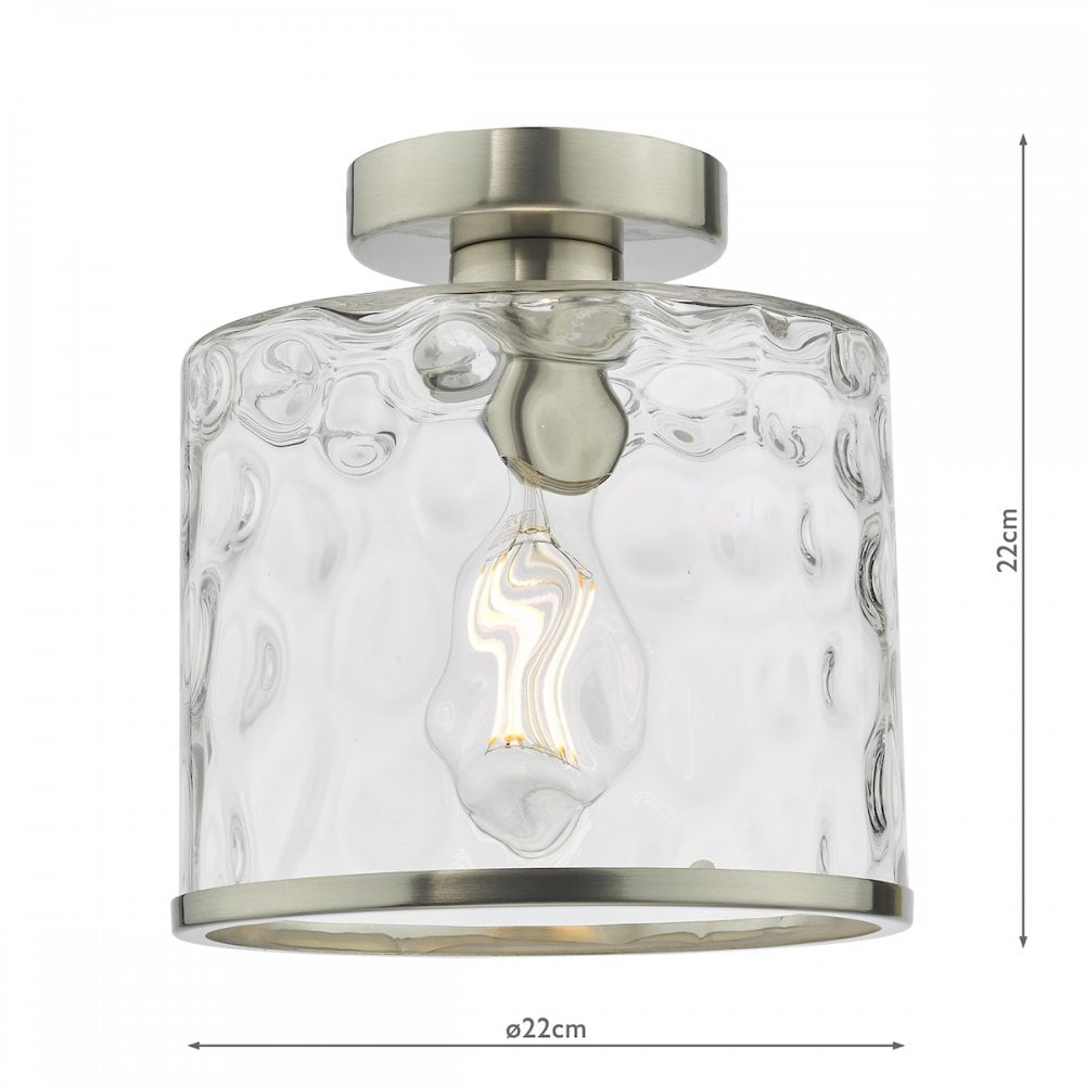 The Olsen Semi-Flush Satin Chrome and Glass is a beautiful semi-flush fitting with a natural looking dimple glass shade and matching metal trim. The Olsen semi-flush is suitable for an entryway, dining room or anywhere a little style is needed.