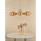 The Ophira 8 Light Pendant combines antique gold arms with amber ripple glass shades, creating a striking feature chandelier with a warm, inviting glow. Designed for stairwells, entertaining spaces and open-plan rooms, its generous scale brings both light and presence to larger interiors. Balancing Danish-inspired minimalism with artisan detail, the Ophira offers timeless elegance and architectural impact, becoming a statement piece that elevates the entire room.