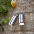 The neat double Ortega wall spotlight features a pair of precision machined solid aluminium cylinder with clear glass, mounted on a matching round wall plate. Adjustable, so you can direct the two lights just where you want, this is an attractive and practical addition to your outside space.