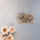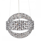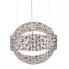 The Victoria pendant has one suspended horizontal ring with another inside it, at a vertical tilt, forming a globe shape. Each ring is filled with round faceted crystals in two sizes, held in position by looped wire circles. The crystals have a smoked finish, formed by electroplating, giving interesting sparkles and reflections, heightened by the polished chrome finish of the framework.