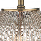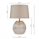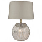 The SONIA 2lt Table Lamp features a warm antique silver illuminated base and has a taupe faux satin tapered drum shade.