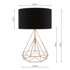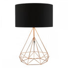 SWORD - a delicate bright copper wire base topped with a black lined cotton shade. Black braided cable with an in line switch adds a touch of luxury to this geometric shaped lamp.