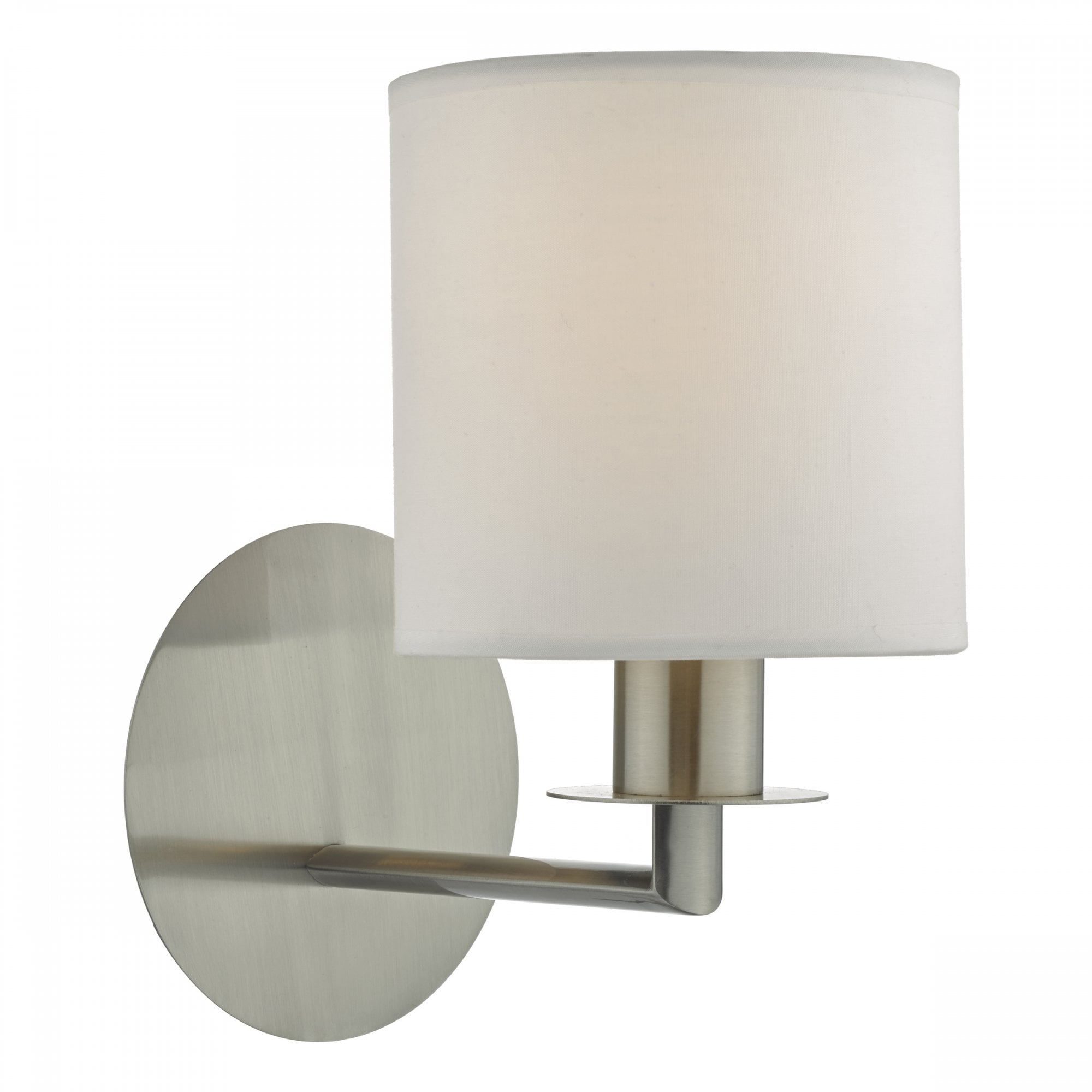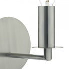 The TYLER wall light is an elegant design with an arm extending out from a circular plate in a satin nickel finish. Supplied as fitting only; shown with shades S066 (sold separately).