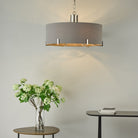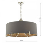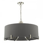 The Veyron 6 light pendant ceiling light in polished nickel with grey faux silk shade. 1m of chain is included which can be adjusted on installation depending on how low your ceiling is or how high you’d like to hang the ceiling light.