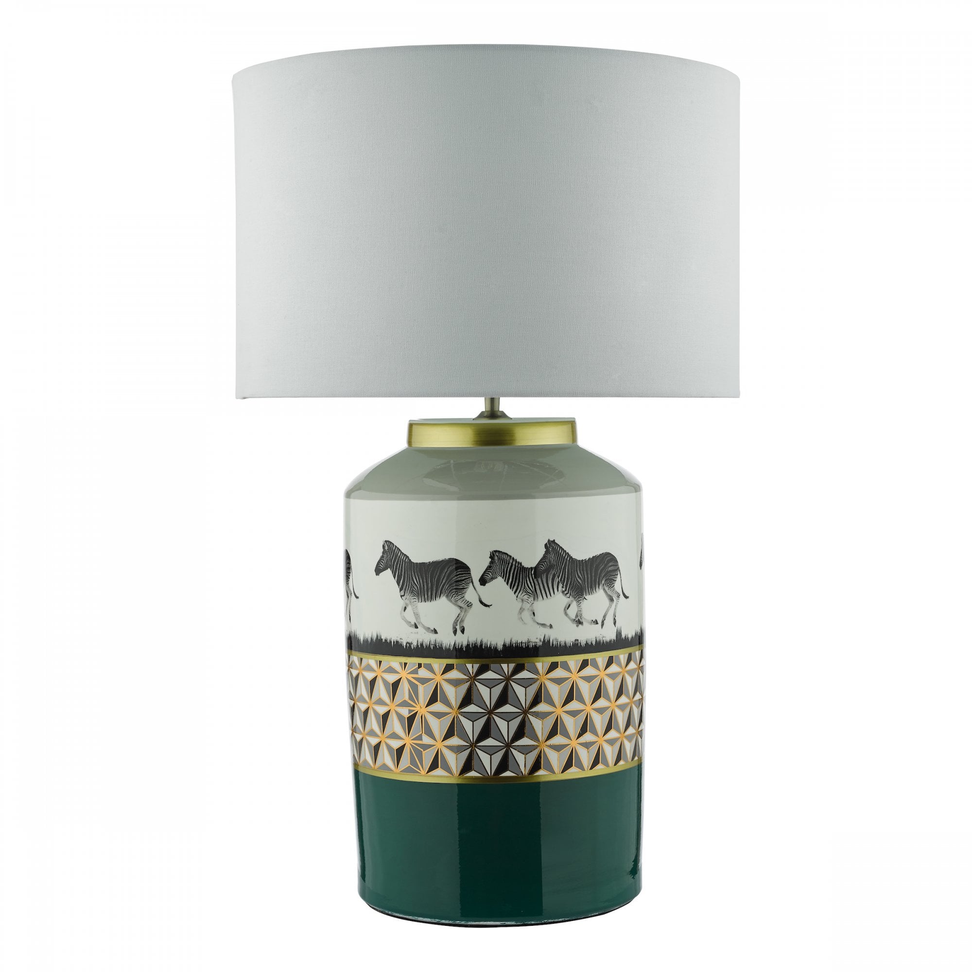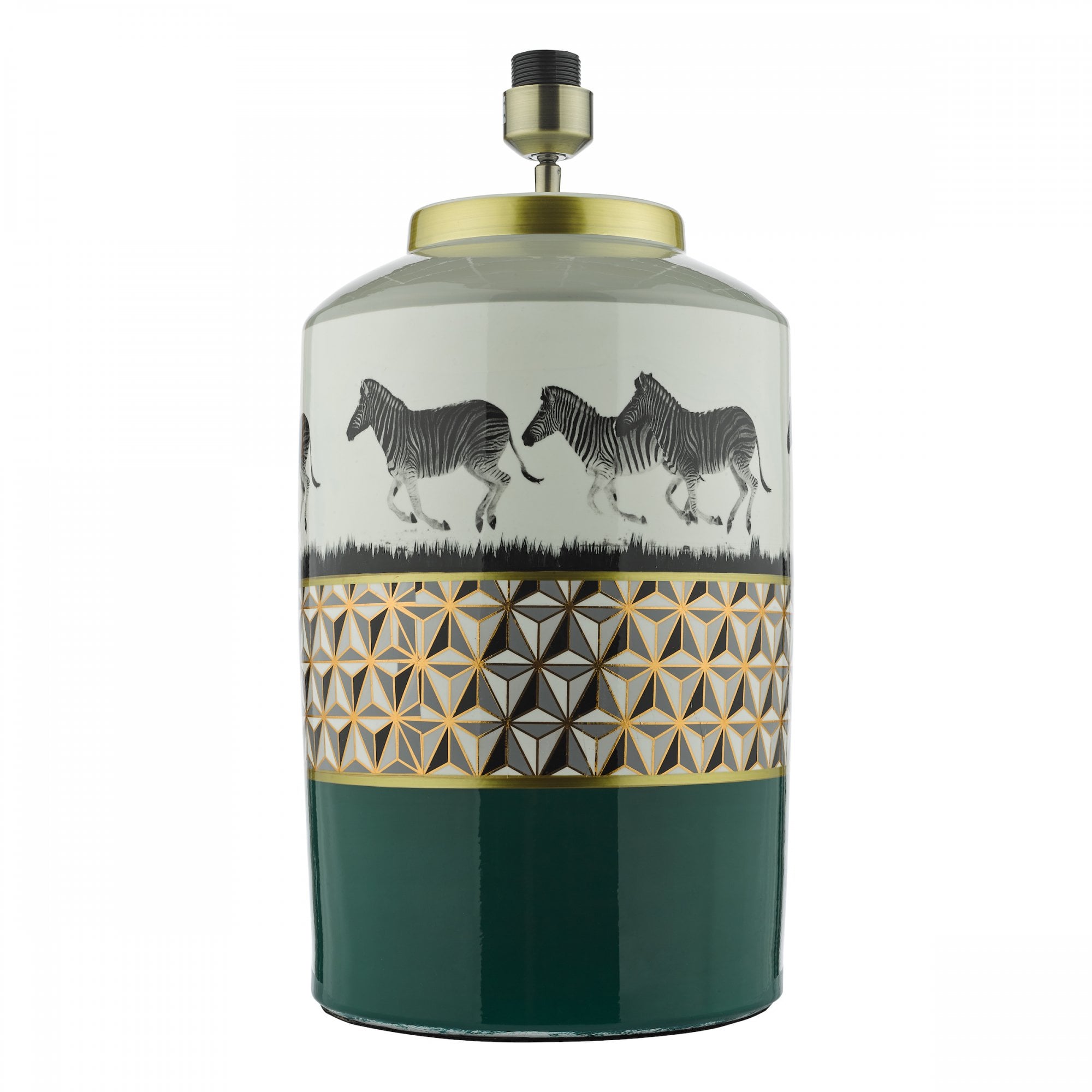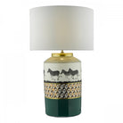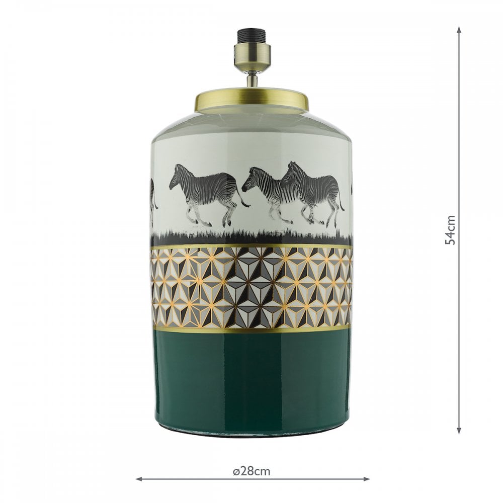 Traditional 1 light table lamp base with green and white finishing and zebra design.