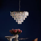 The EULALIA crystal chandelier, is the perfect statement ceiling light for a grand entrance hall, or over a large dining table. With layers and layers of beautiful coffin crystal complemented by a perfectly proportioned top metal band in polished nickel.