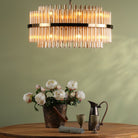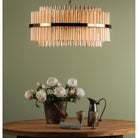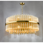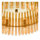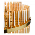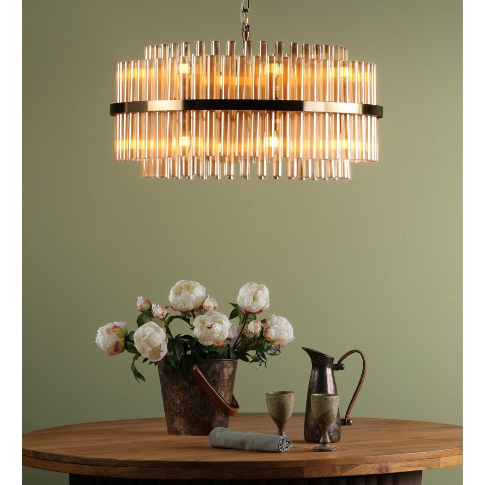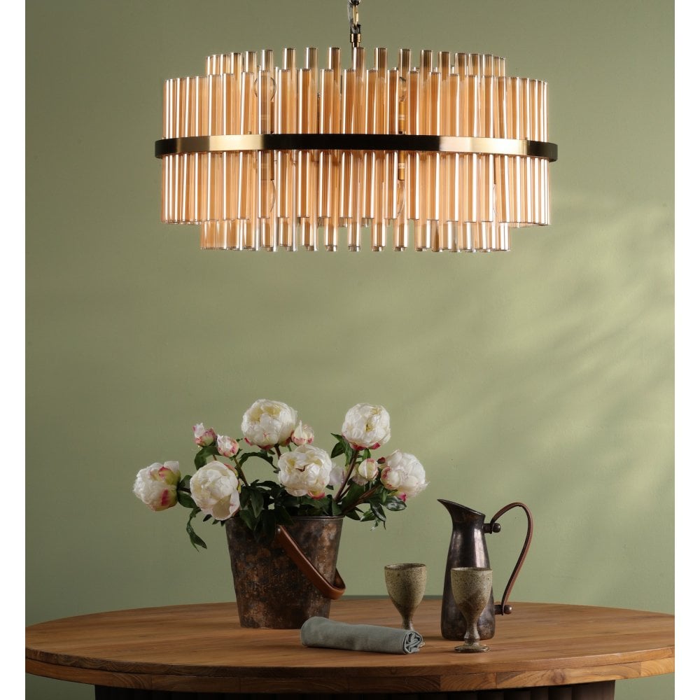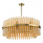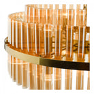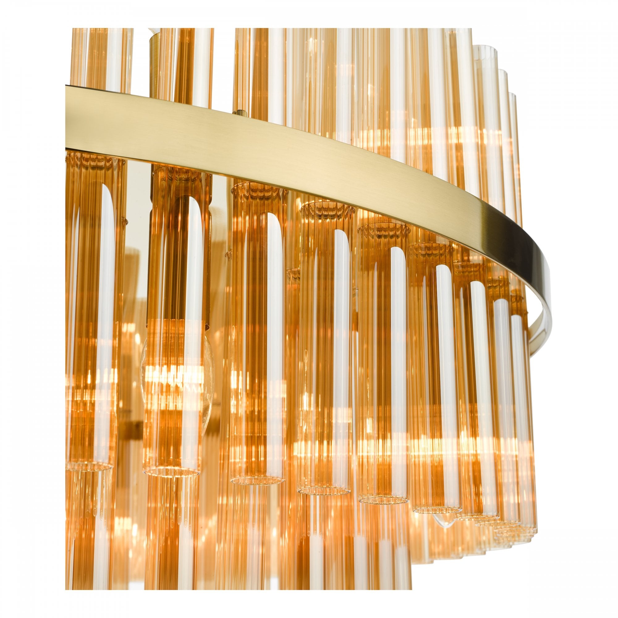Introducing the Imani 16 Light Pendant Natural Brass and Champagne Glass, a masterpiece of modern design and sophistication that elevates your living space to new heights. This pendant features a captivating arrangement of oversized ribbed glass rods in a rich amber hue, encased within a complementary bronze ring. The polished gold interior adds a touch of opulence, creating the illusion of the glass floating effortlessly above.