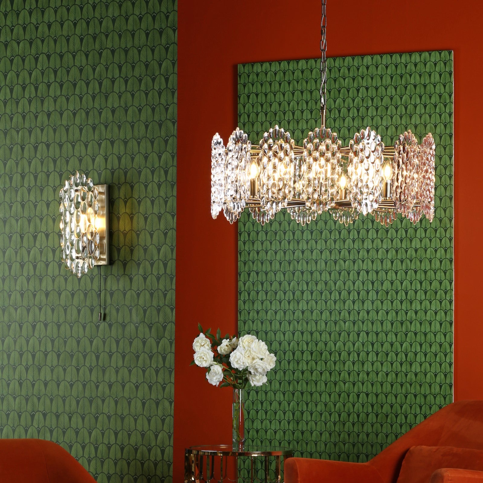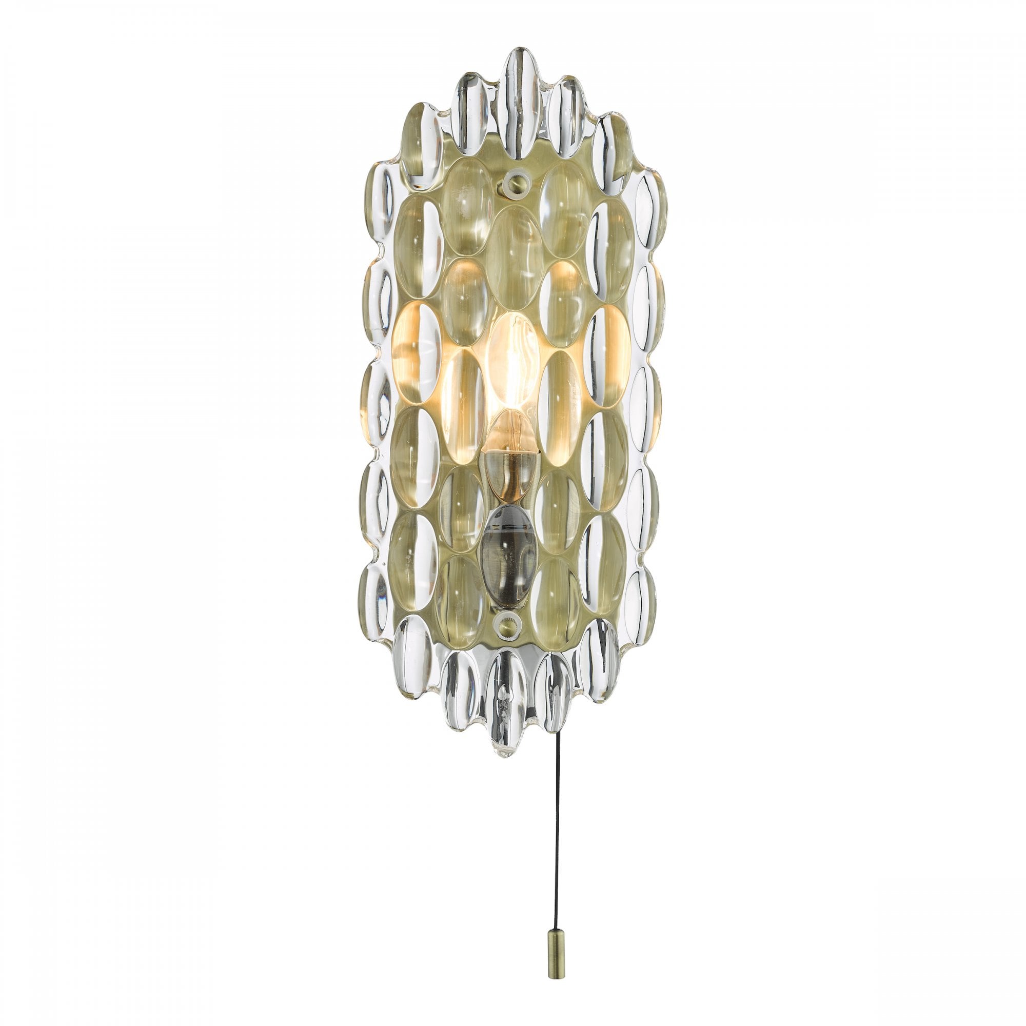 The Porthos single wall light features a textured glass with elongated lenses giving a unique effect to this statement wall light. The natural brass frame is elegant and features a pull cord switch for convenience which can easily be removed if not required.