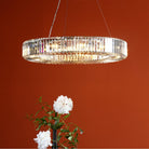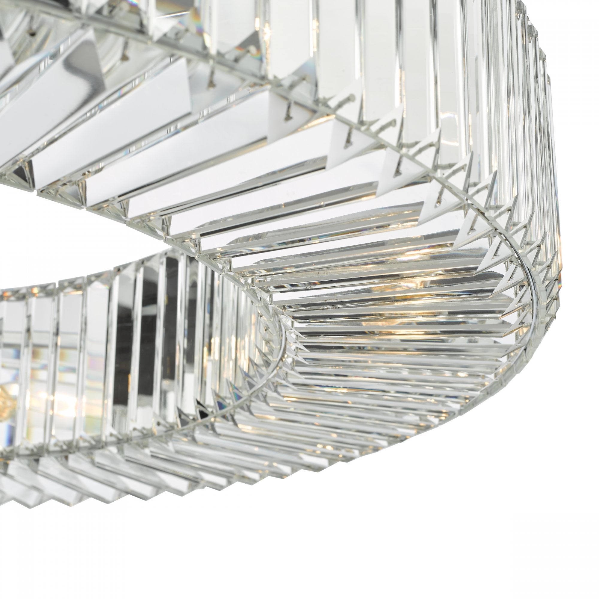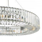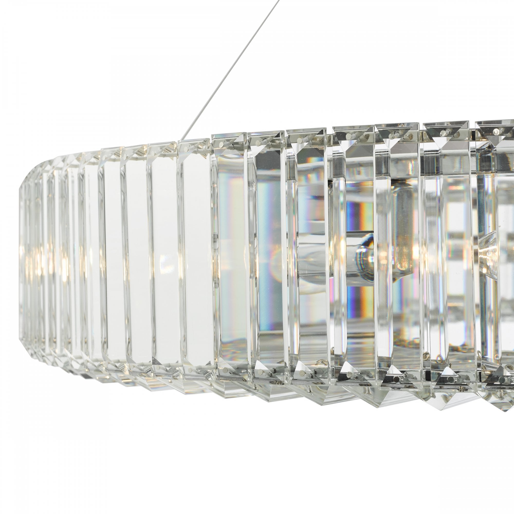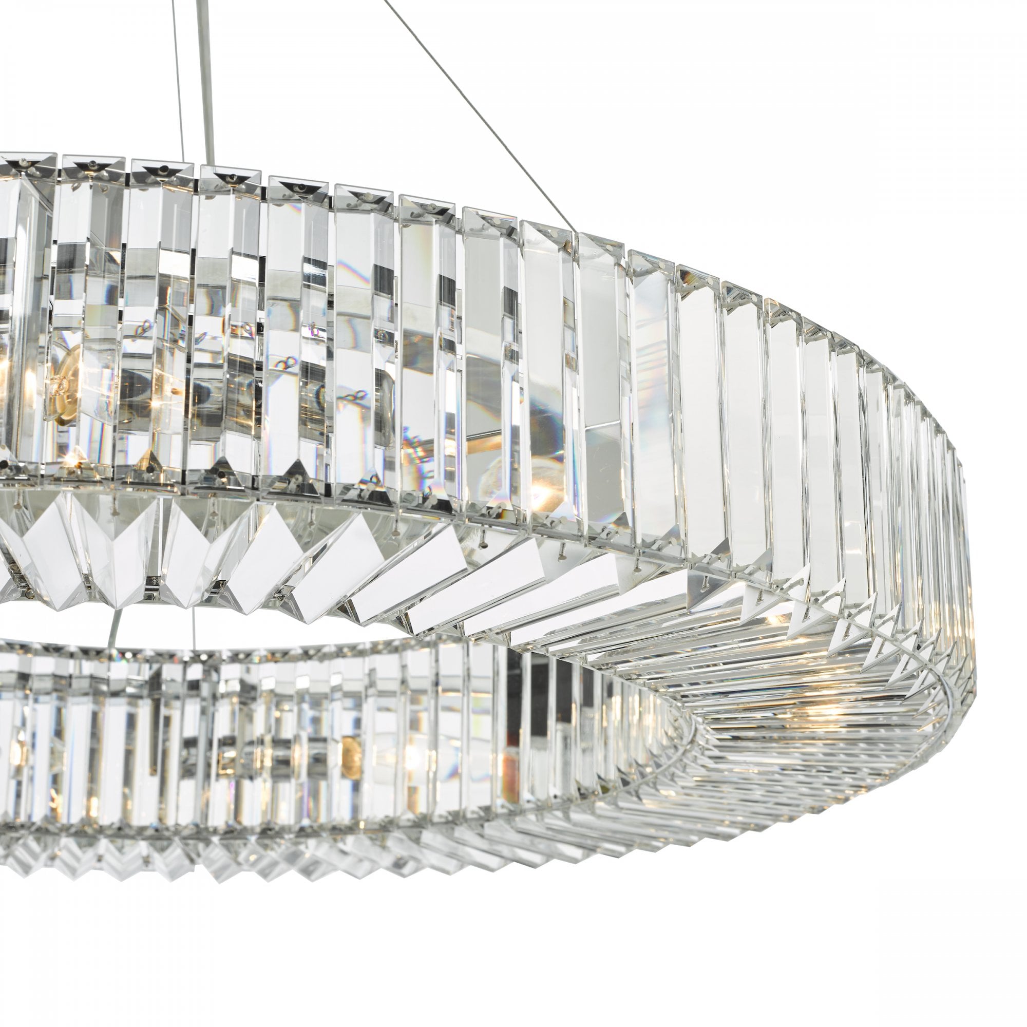 This circular chandelier comprises hundreds of pieces of beautiful bevel cut crystal. Its shallow height, combined with steel tension cables and reflective crystal coffins creates a sense of weightlessness. With a diameter of over 80cm and an adjustable height of between 50 and 200cm, this large chandelier is very versatile. The clear crystal reflects its surroundings effortlessly to create a stunning centre piece.