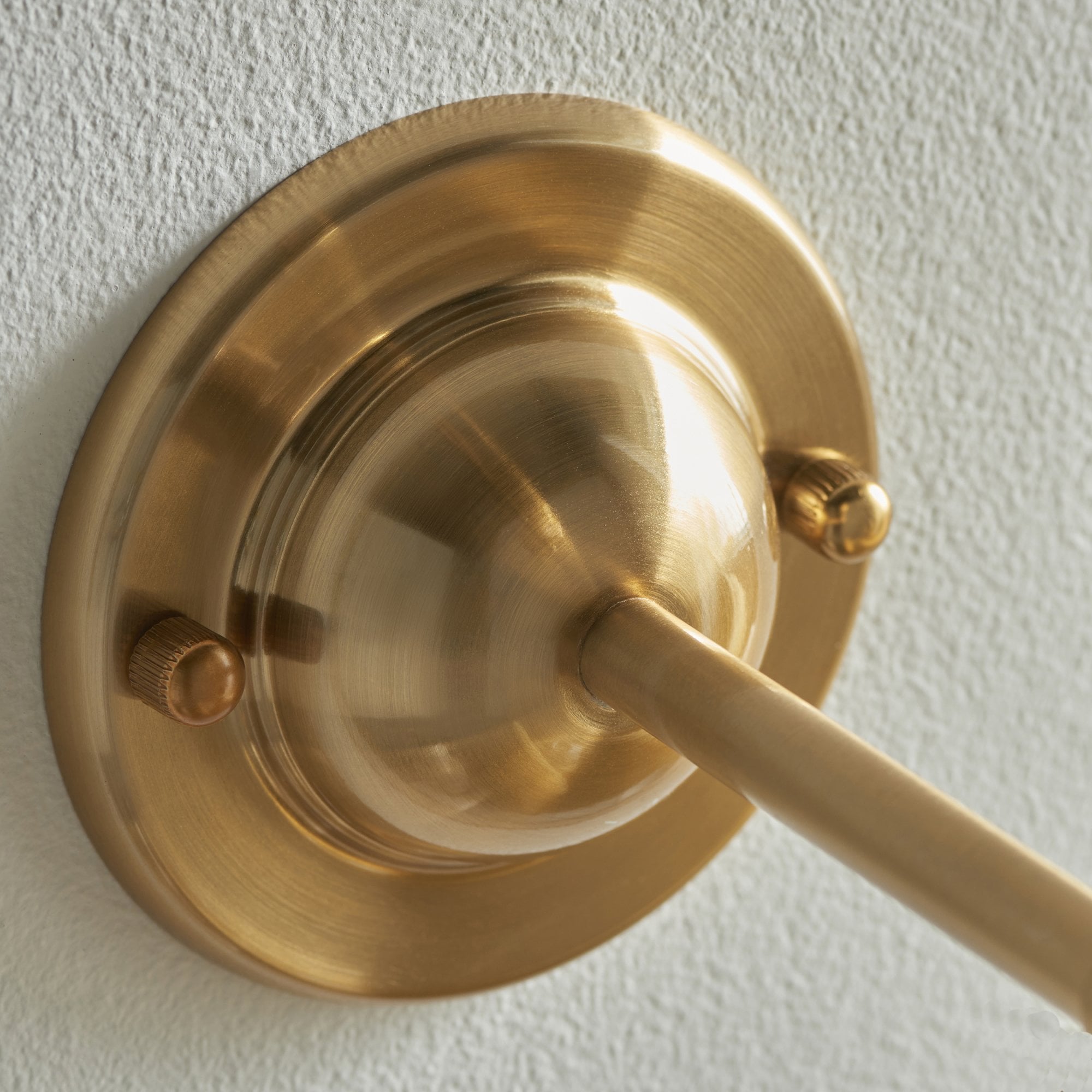 A classic and understated wall light featuring a dome shaped wall back with an elegant linear arm. Perfect for many areas of your home, finished in brushed aged brass. Complete the look with one of our decorative fabric shades.