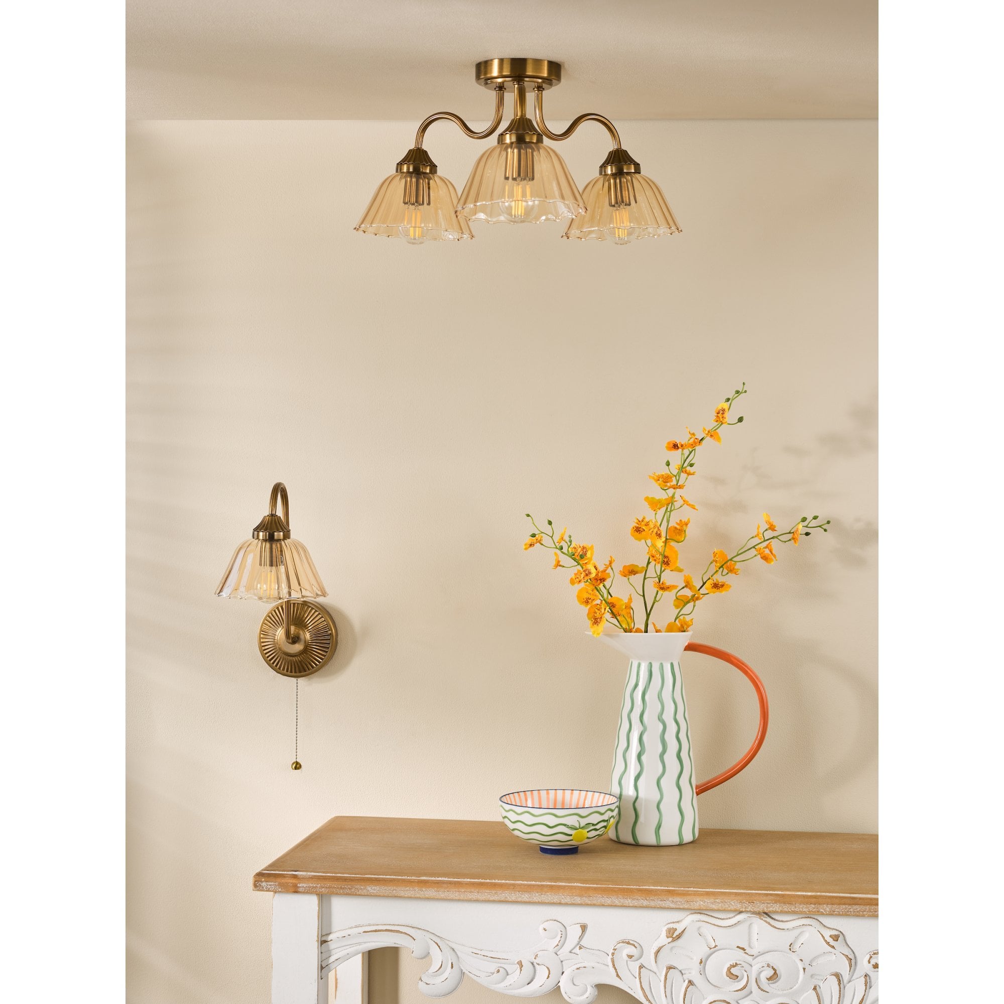 The Erika wall light brings classic elegance in a compact, versatile design. Finished in warm bronze, it features a ribbed curved arm supporting a single amber glass shade, softly diffusing light to create a warm, inviting glow. Perfect for bedrooms, living rooms, or hallways, it enhances layered lighting schemes with both decorative and practical effect. LED compatible, it allows for energy-efficient performance without losing traditional charm. Whether styled in pairs beside a mirror or used alone to accent a feature wall, the Erika wall light adds timeless sophistication to any interior.