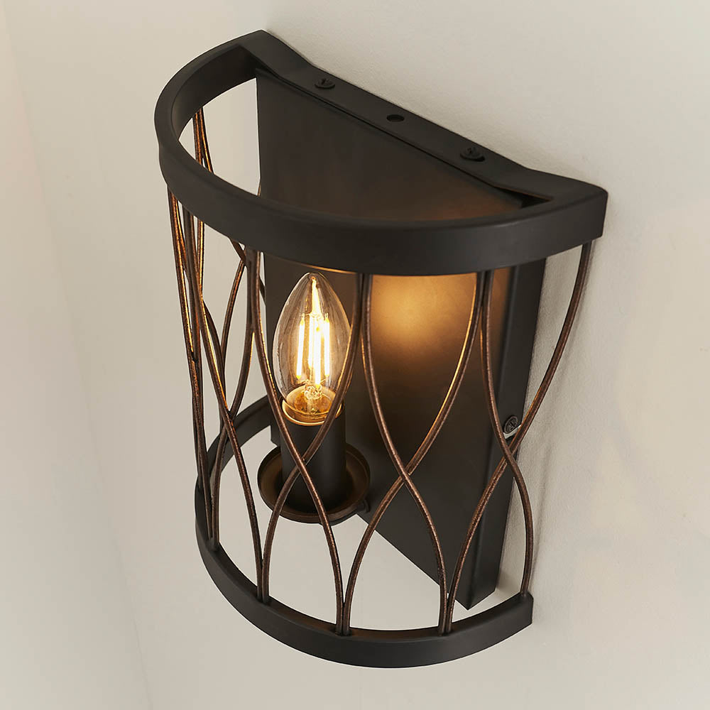 The rustic Heston wall light has a matt black & rustic bronze effect finish. This fitting is suitable for use with LED lamps and dimmable.