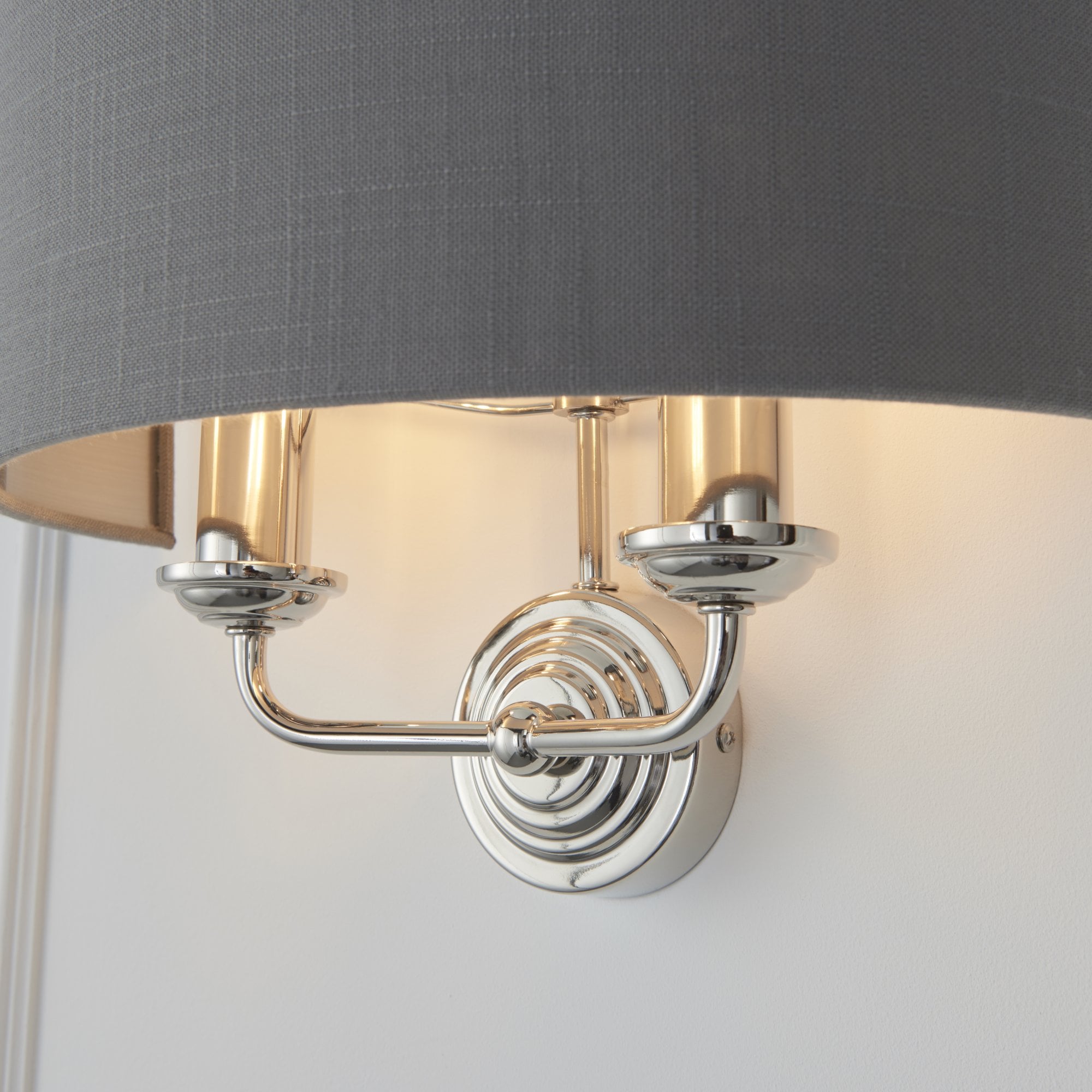 The Highclere twin wall light is a sophisticated combination of charcoal linen mix fabric with a reflective brushed metallic inner and bright nickel metalwork. This statement wall light is the perfect timeless addition to modern and classic homes of today.