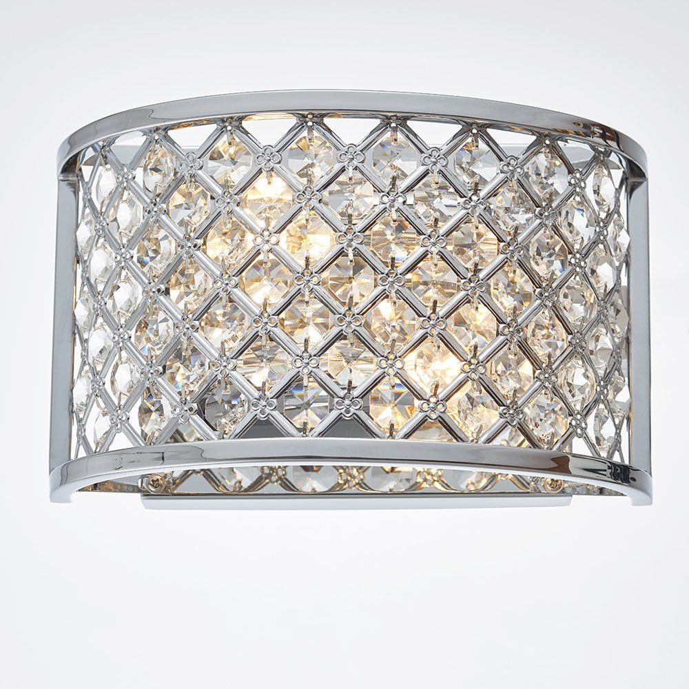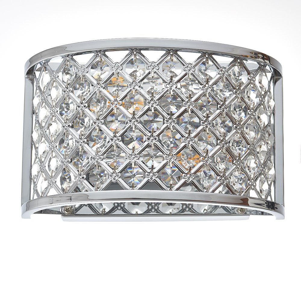 A 2 light wall fitting is made of crystal beads which sit inside a chrome steel frame, all in a polished chrome finish. Dimmable and suitable for use with LED lamps.