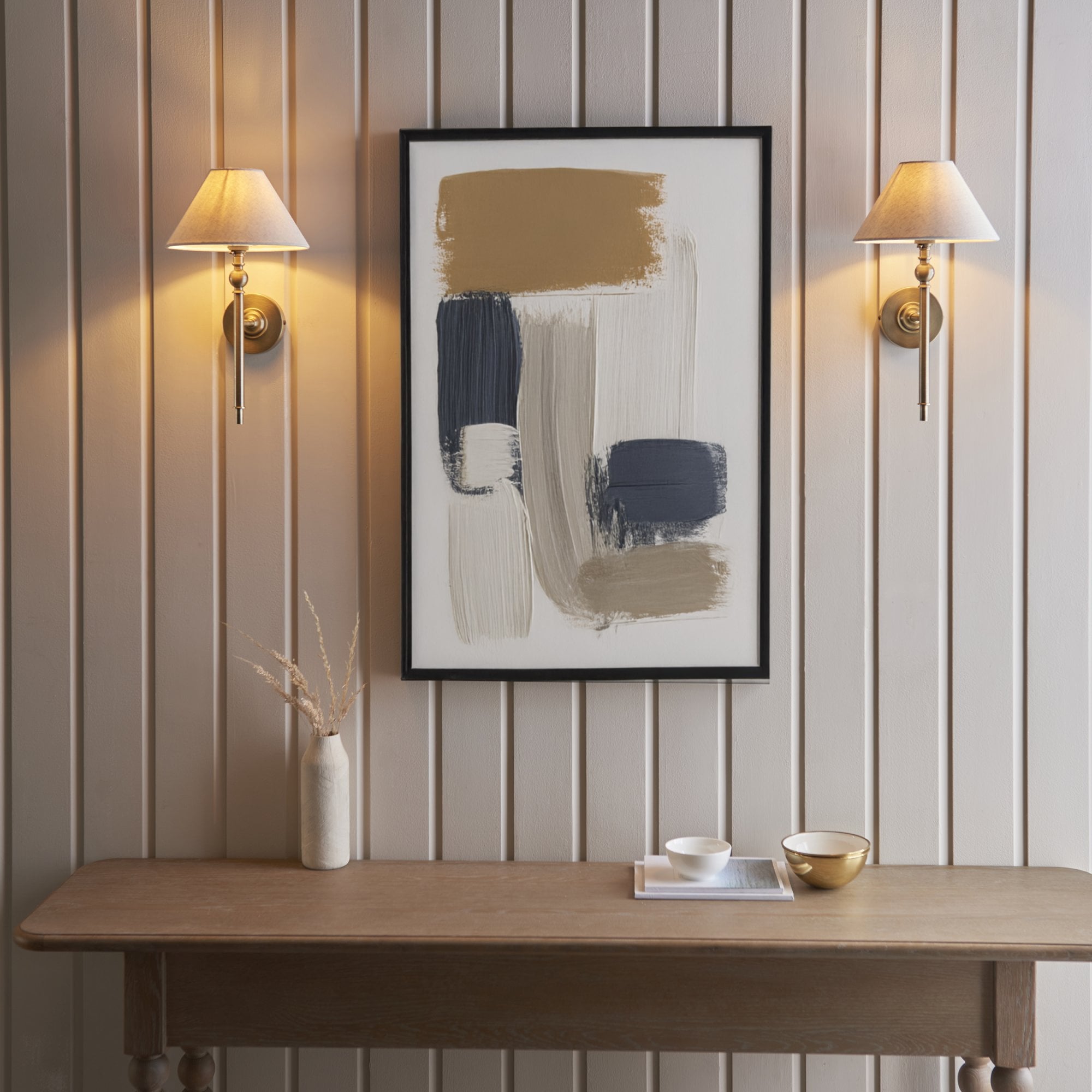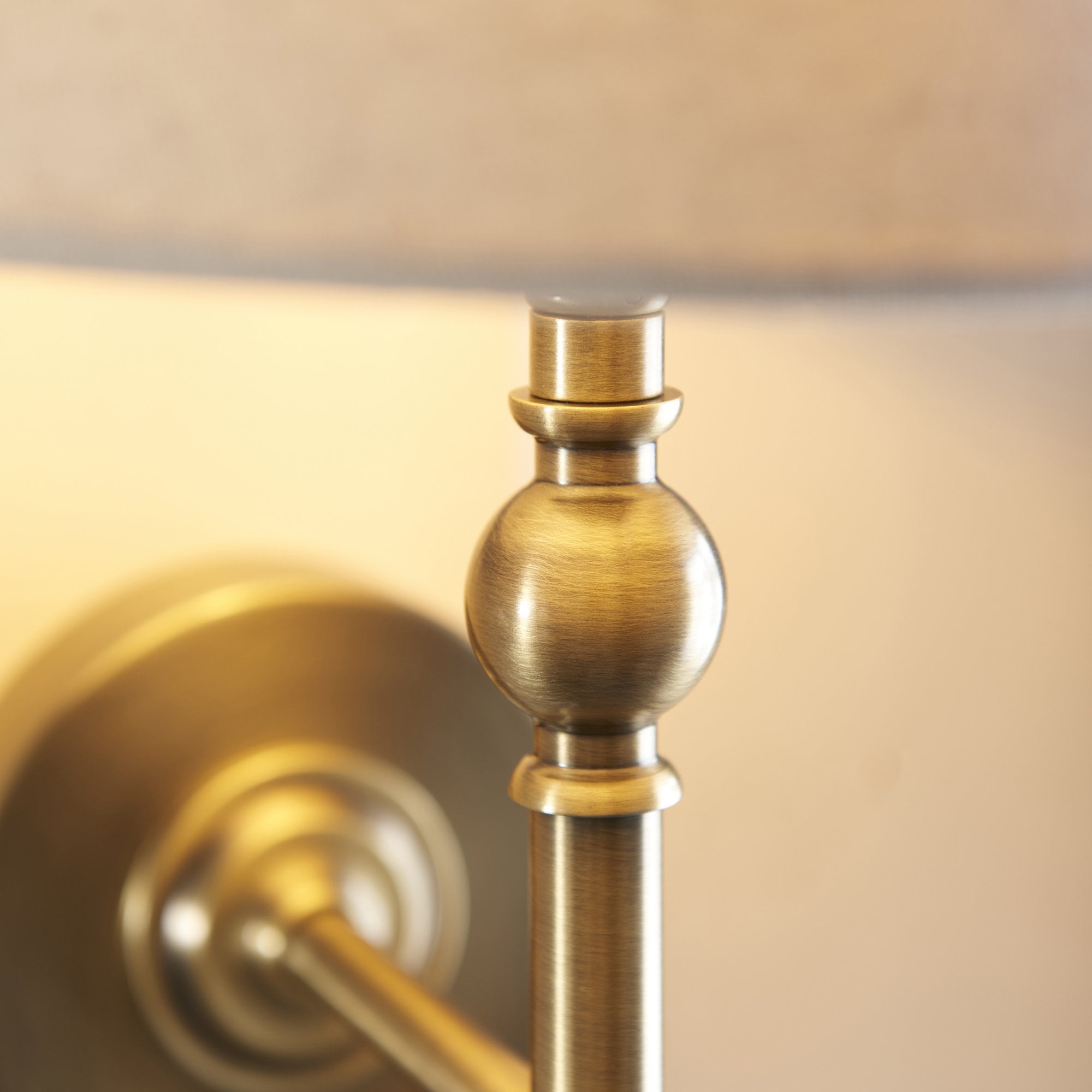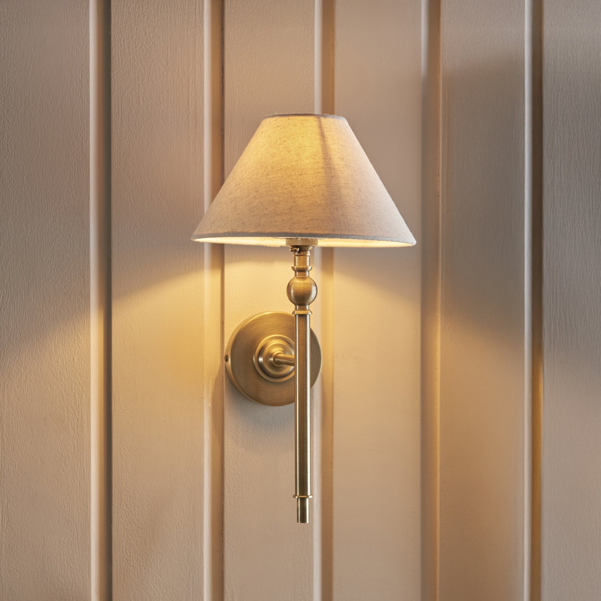 This elegant wall light is finished in antique brass plate and features a timeless tapered shade in natural linen fabric. Complete with a B22 lamp holder for an authentic classic look, making it a wall light to be proud of. Matching items available.