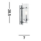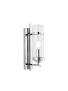 The sleek chrome finish fitting features a slim rectangular wall plate, with a strip of metal running through the centre, and two right angled arms attached to a beautifully designed cylindrical glass shade. The shade contains a candle style fitting that provides a clear source of light.
