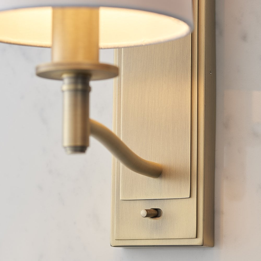 The Ortona wall light is finished in a matt antique brass effect plate with a vintage white faux silk shade. Operated with a toggle switch, dimmable and suitable for use with LED lamps. Matching items available.