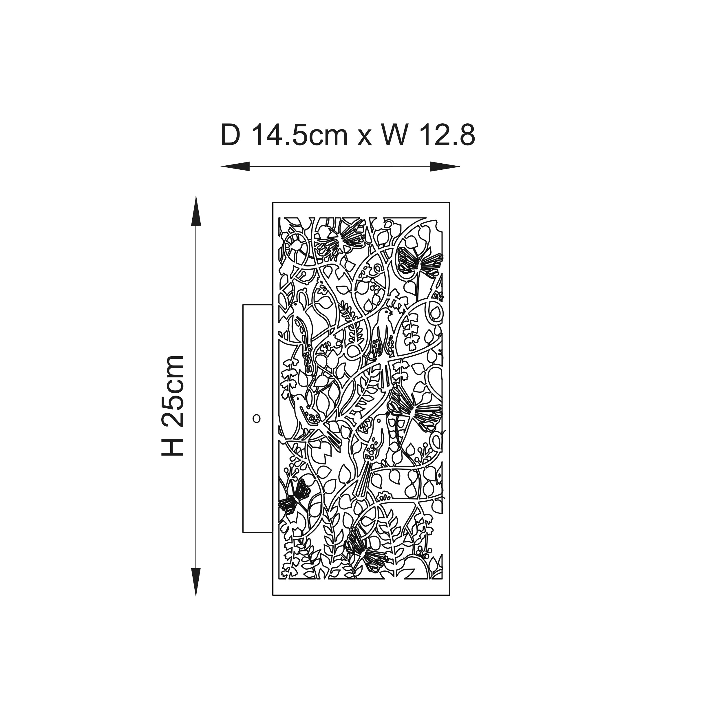A delicate indoor wall light with a secret garden design of leaves, dragonflies and birds, in an antique brass finish. Casts a decorative light pattern, suitable for use with LED bulbs.