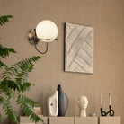 Antique brass and an opal white glass shade provide a feeling of classic style, suited to complimenting a traditional home. Although the overall aesthetic is traditional, a singular black braided cable suspends from below the light and creates a slight modern feel.