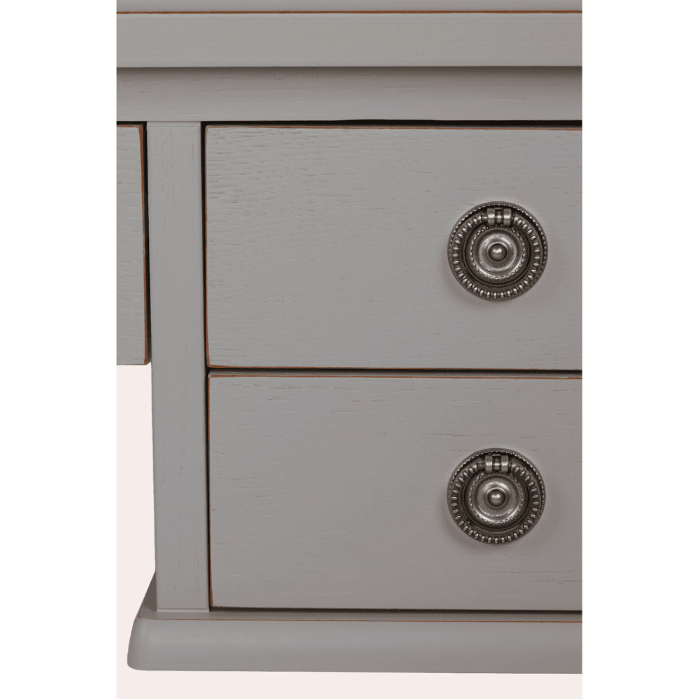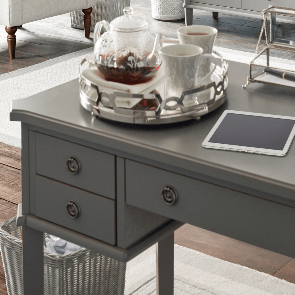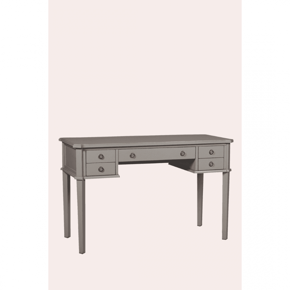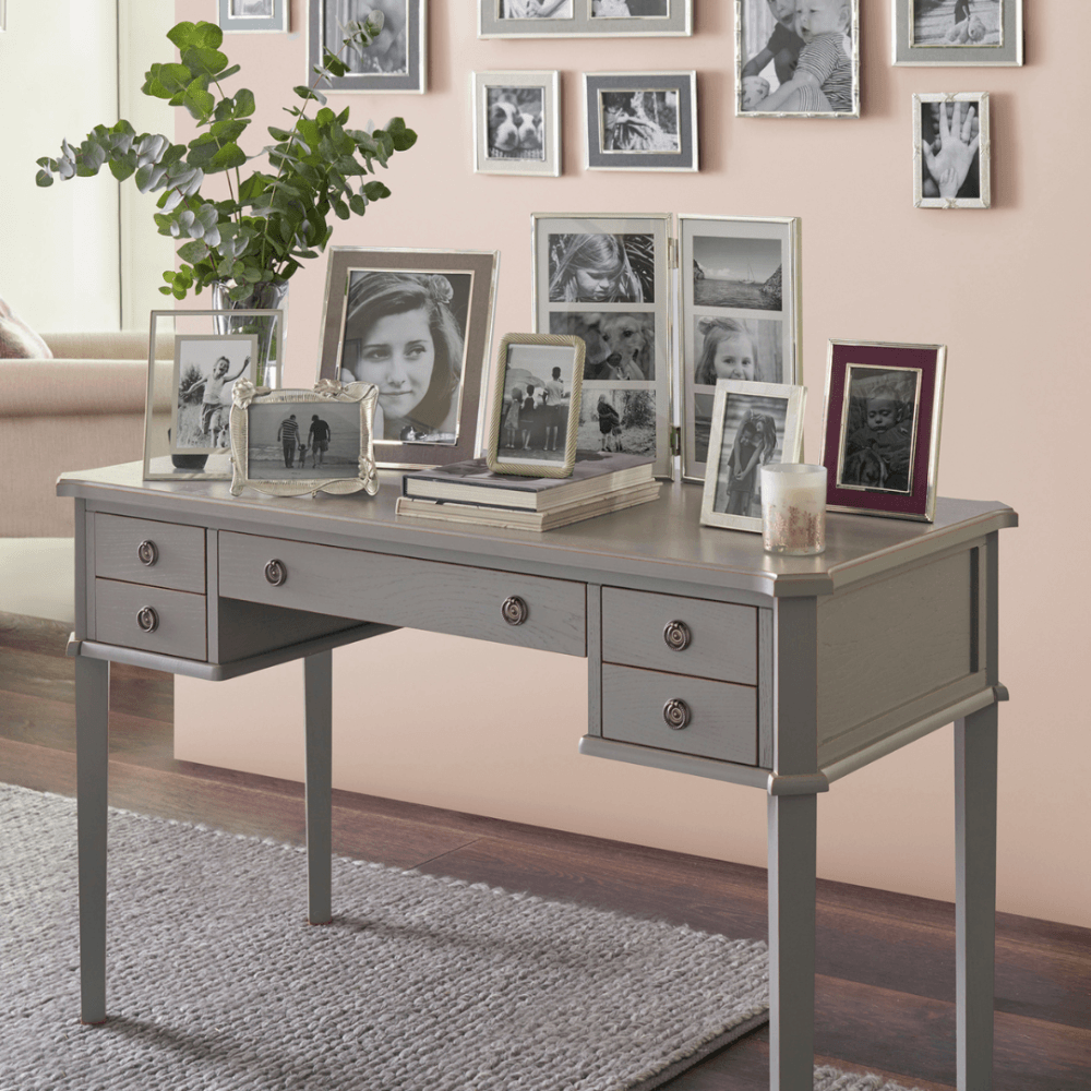 The Laura Ashley Henshaw 5 Drawer Desk is a sophisticated addition that makes an elegant statement in any home study. This desk features four small drawers and one wide drawer, providing ample storage space for documents and stationery. Crafted from a blend of solid wood, veneers, and modern materials, it showcases exquisite craftsmanship. Hand-painted and finished with a clear lacquer, it requires low maintenance while retaining its stunning appearance. Assembly is hassle-free, as only the side panel legs need to be attached, eliminating the need for full assembly. Enhance your home study with this beautiful and practical desk.